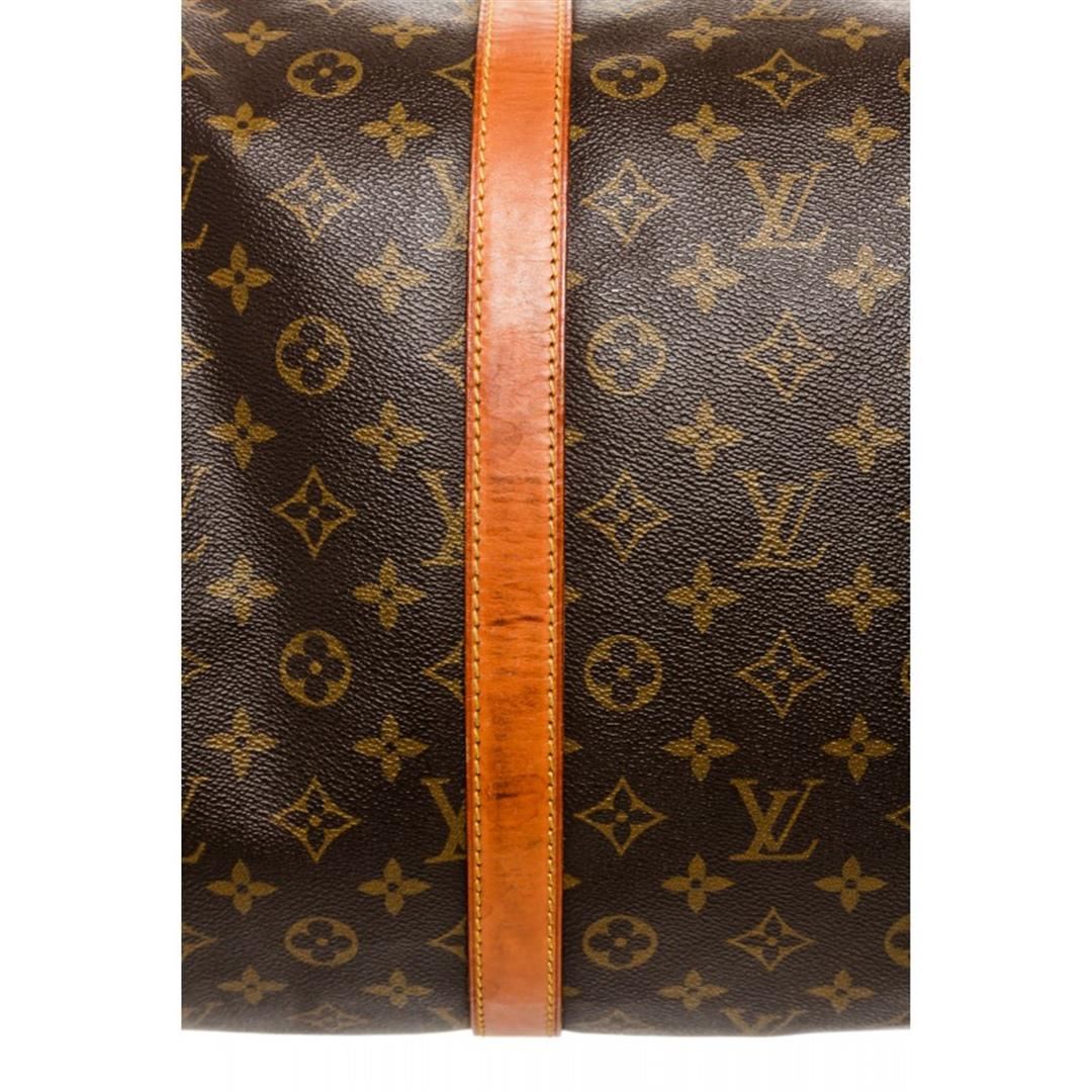 Brown and tan monogram coated canvas Louis Vuitton Keepall 55 with brass hardware, tan vachetta leather trim featuring yellow contrast stitching, dual rolled top handles, luggage tag, brown canvas lining and zip closure at top.