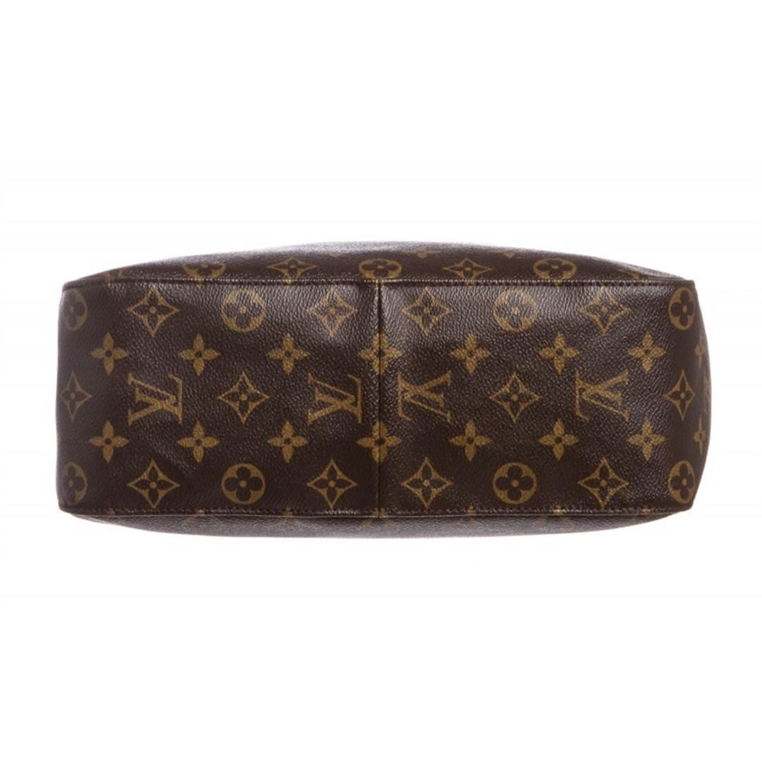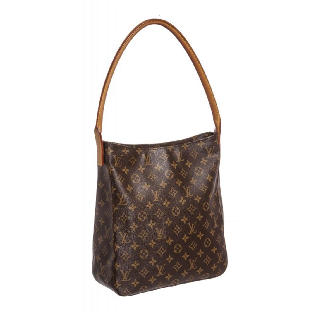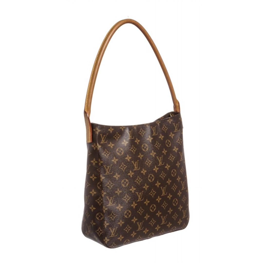 Brown and tan monogram coated canvas Louis Vuitton Looping GM with brass hardware, cinnamon vachetta leather trim, single rolled shoulder strap, beige Alcantara lining, dual pockets at interior walls; one with zip closure and zip closure at top. Item is Pre-Owned.
