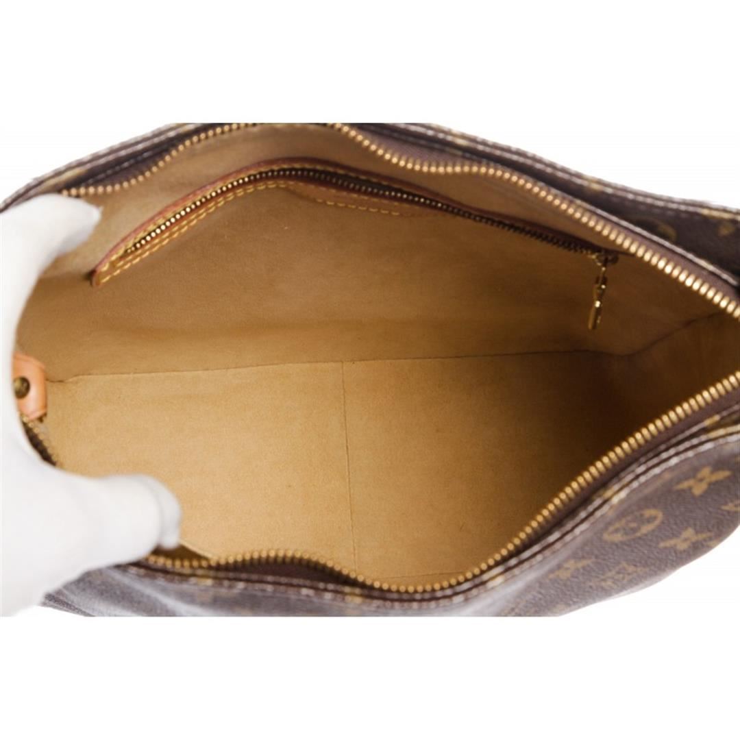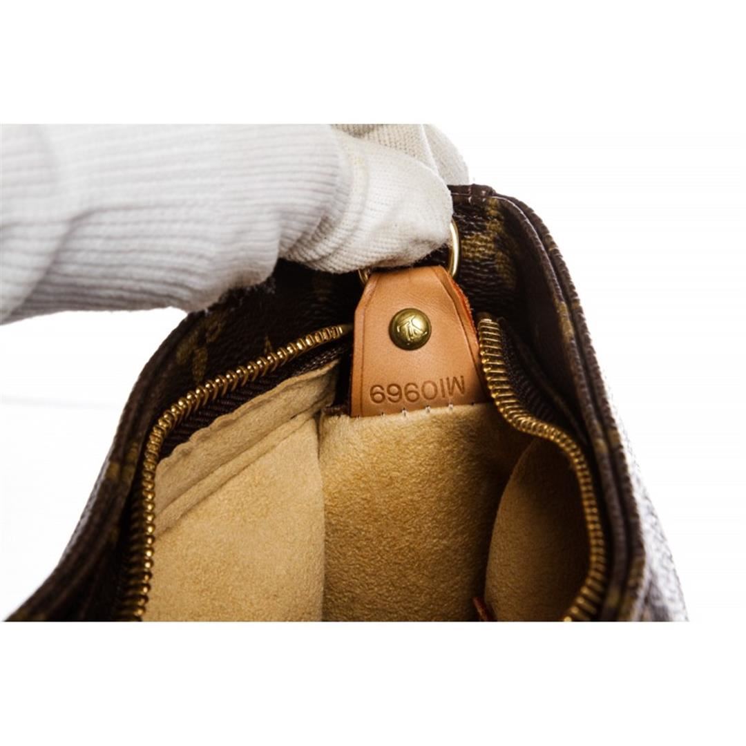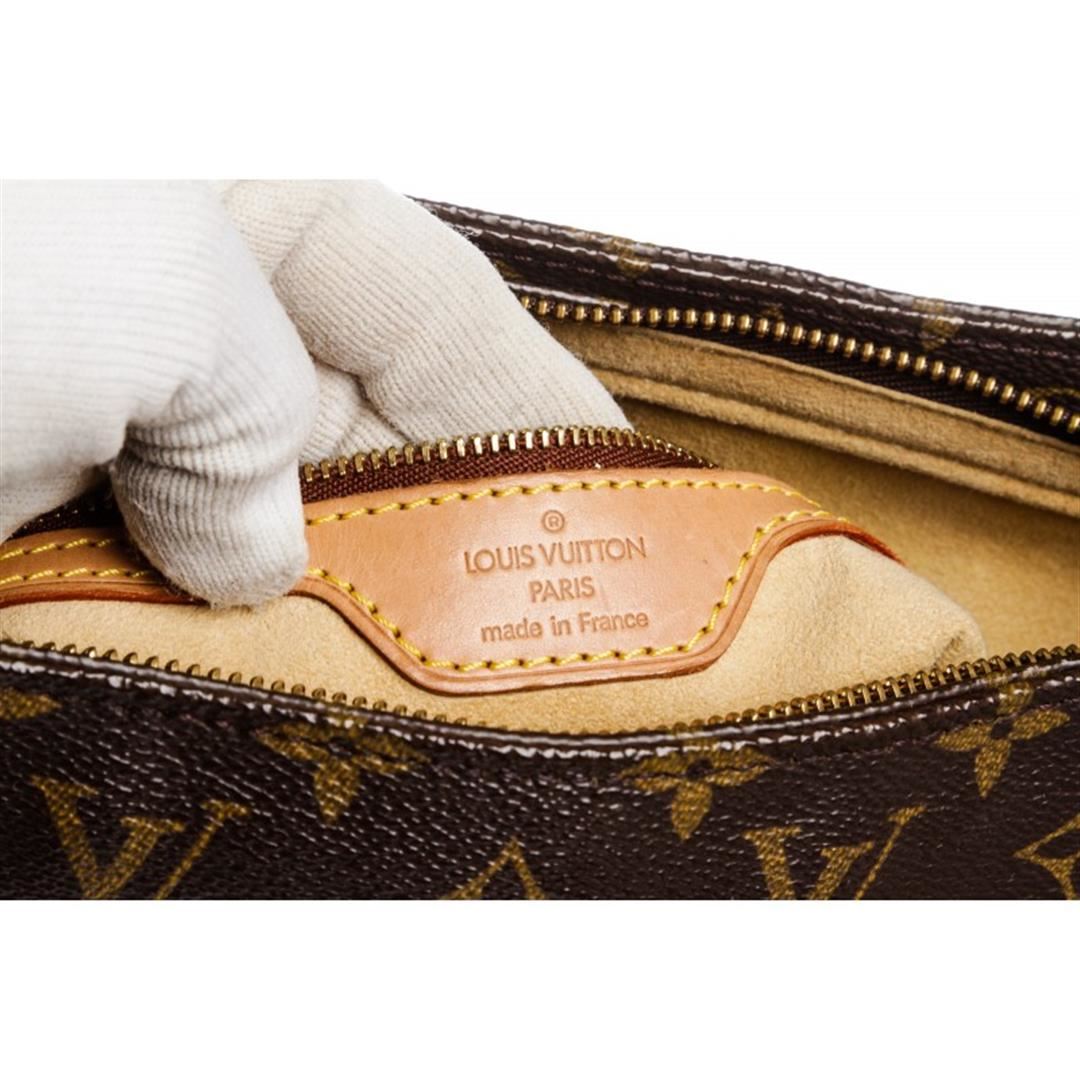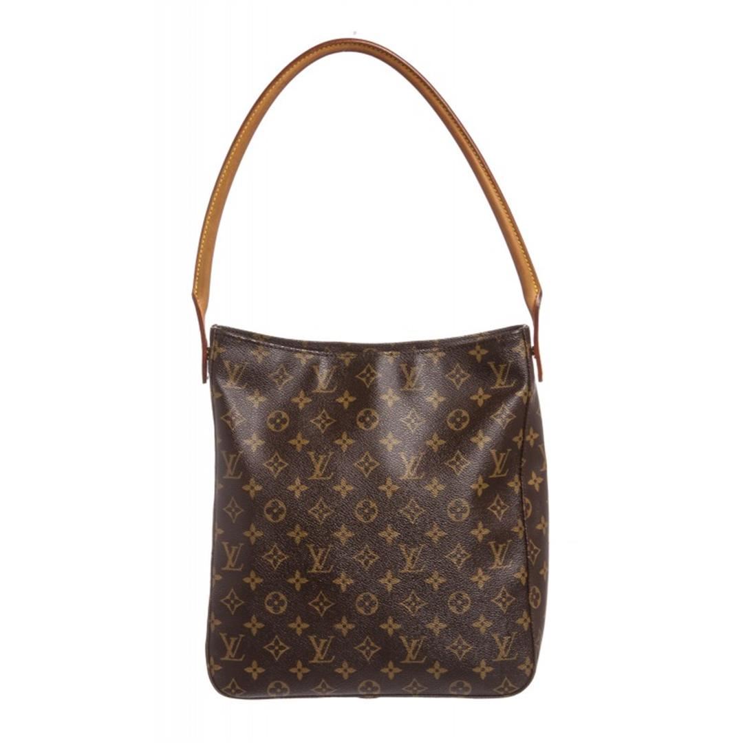 Brown and tan monogram coated canvas Louis Vuitton Looping GM with brass hardware, cinnamon vachetta leather trim, single rolled shoulder strap, beige Alcantara lining, dual pockets at interior walls; one with zip closure and zip closure at top. Item is Pre-Owned.