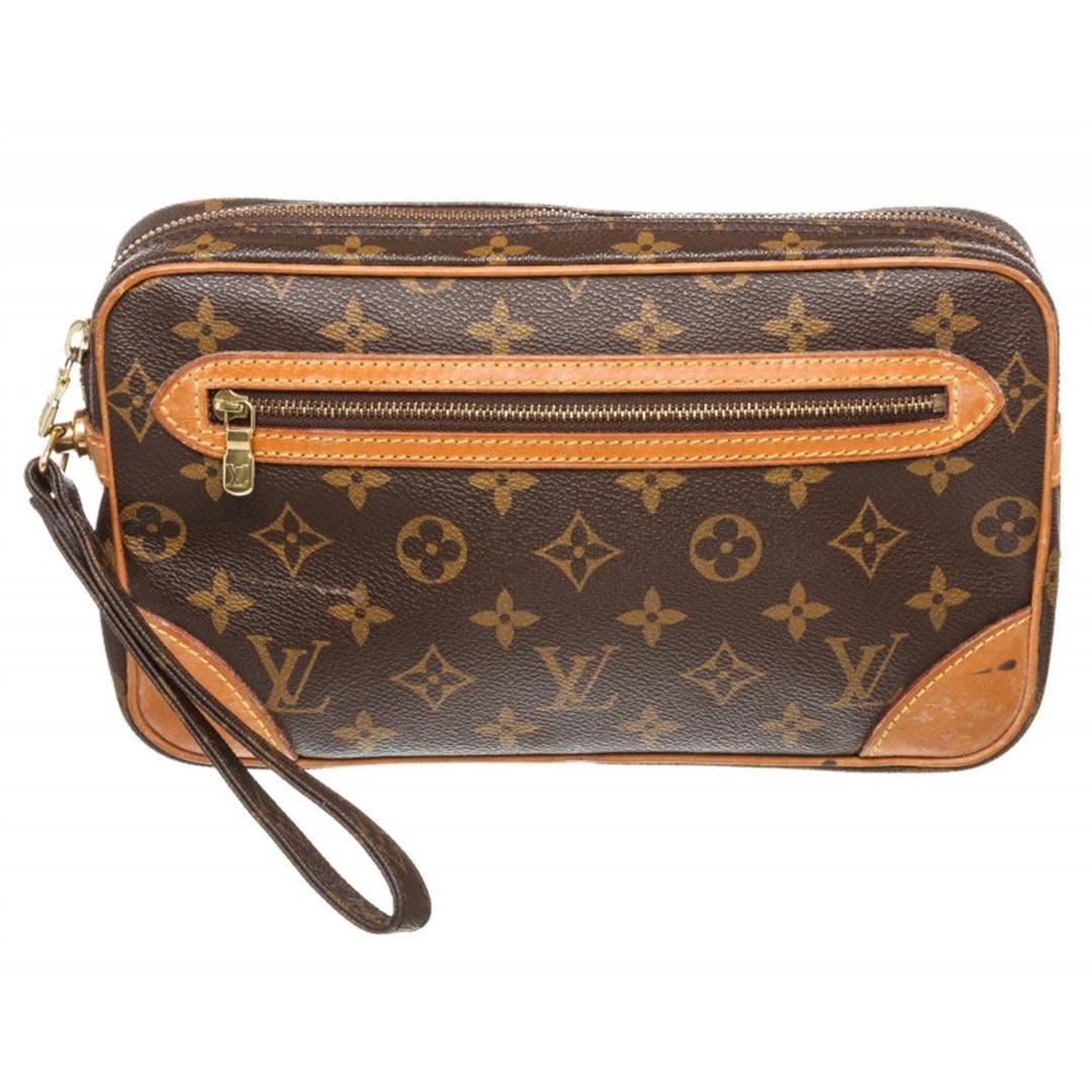 Brown and tan monogram coated canvas Louis Vuitton Marly Dragonne GM with brass hardware, tan vachetta leather trim, single zip pocket at front, single flat wristlet strap, brown Taiga lining, single zip pocket at interior wall and zip closure at top. Item is pre-owned.