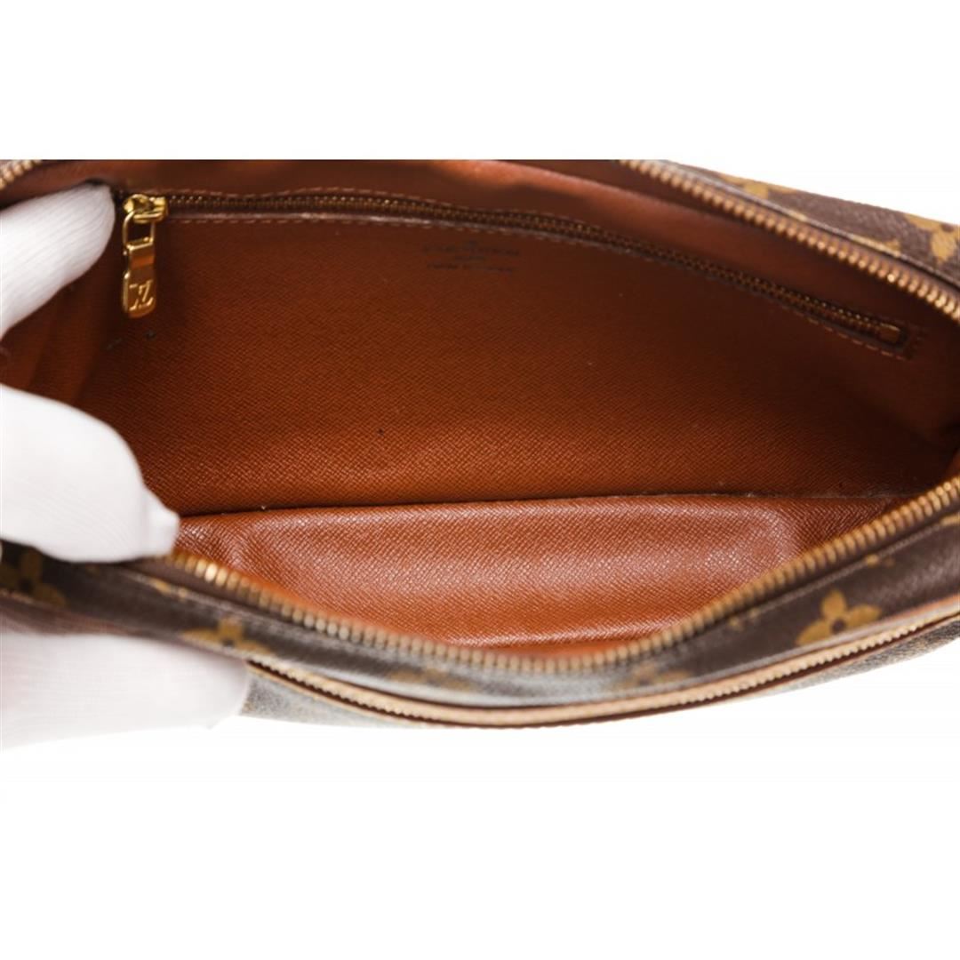 Brown and tan monogram coated canvas Louis Vuitton Marly Dragonne GM with brass hardware, tan vachetta leather trim, single zip pocket at front, single flat wristlet strap, brown Taiga lining, single zip pocket at interior wall and zip closure at top. Item is pre-owned.