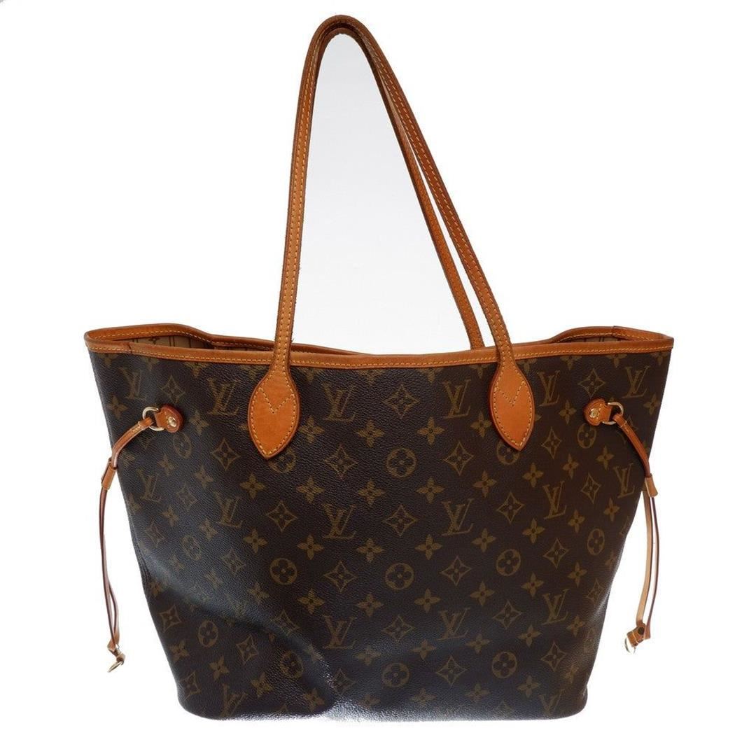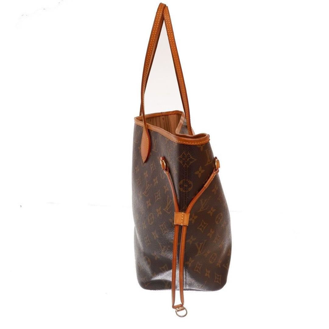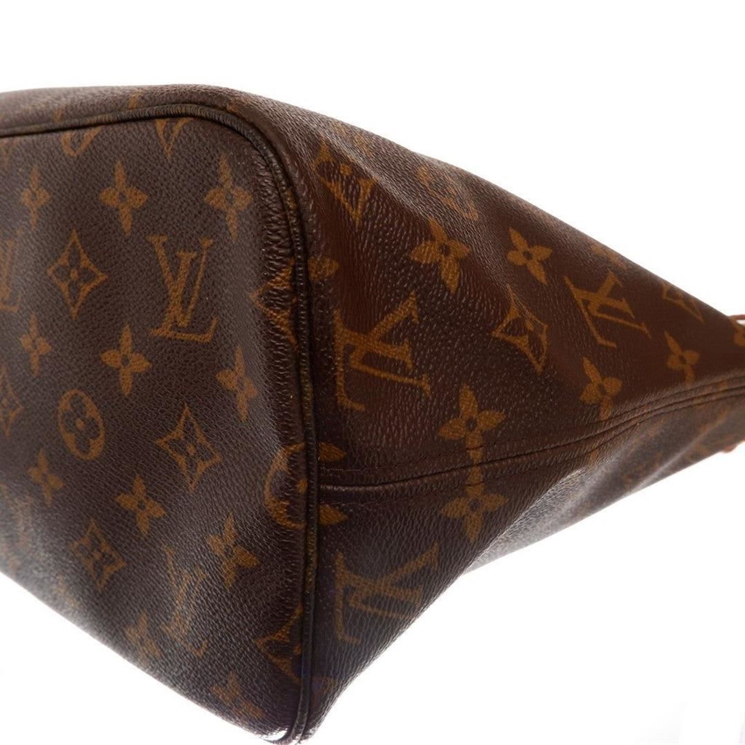 Brown and tan monogram coated canvas Louis Vuitton Neverfull MM with gold-tone hardware, tan vachetta leather trim, dual flat shoulder straps, dual drawstring adornments at sides, striped canvas lining, single zip pocket at interior wall and clasp closure