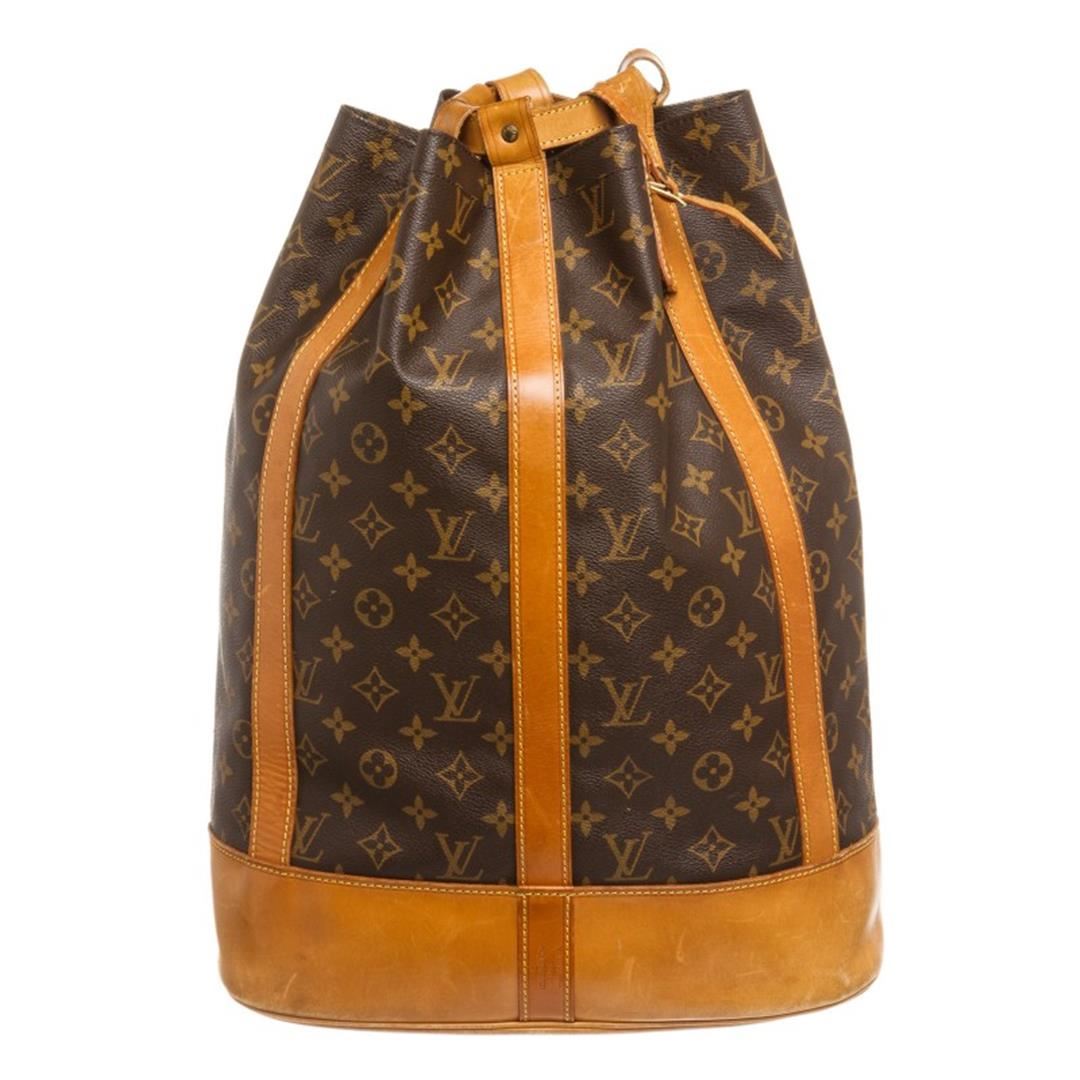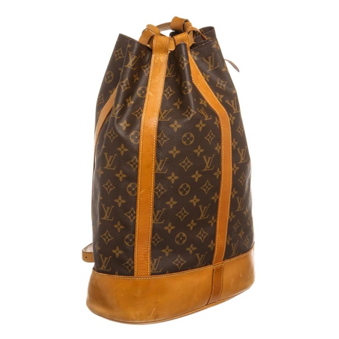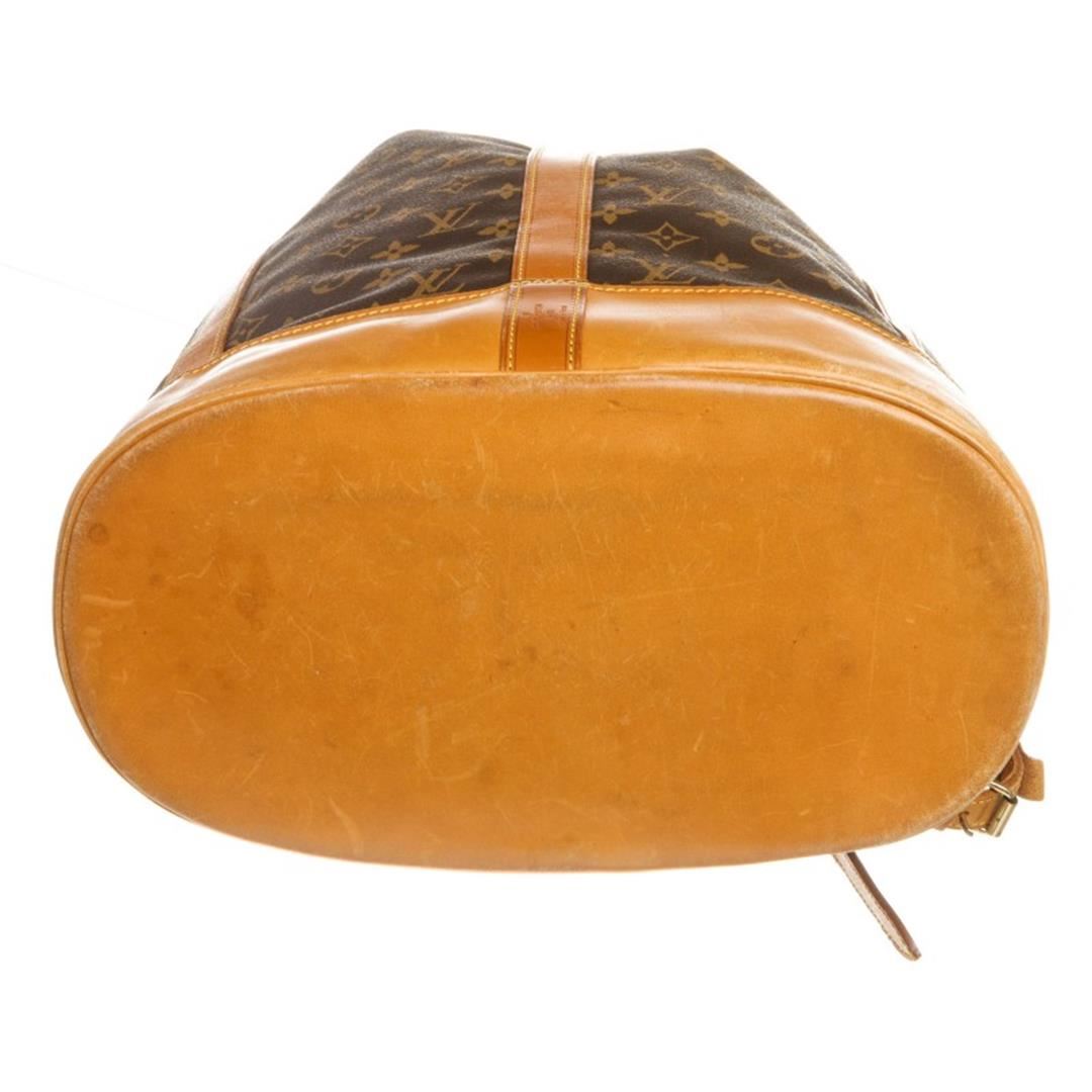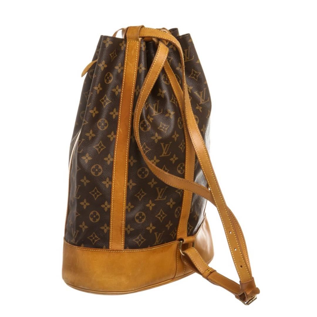 Brown and tan monogram coated canvas Louis Vuitton Randonne backpack with brass hardware, tan vachetta leather trim featuring yellow contrast stitching, dual flat shoulder straps, brown woven interior lining and open top. Item is pre-owned.