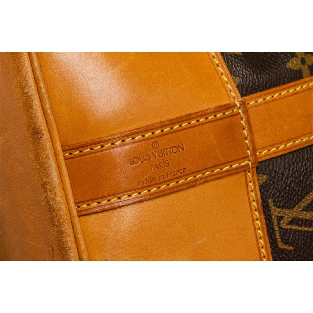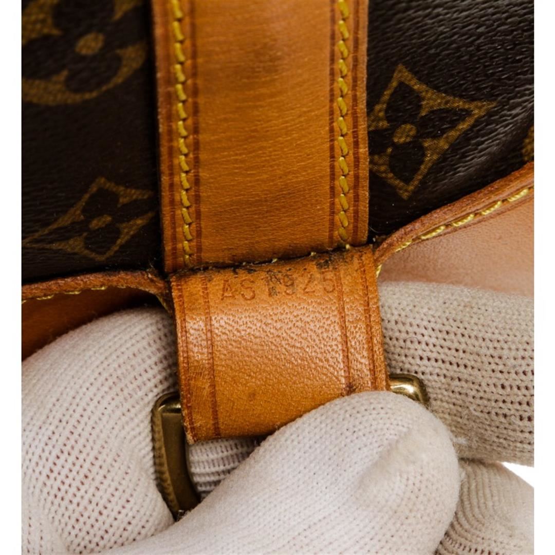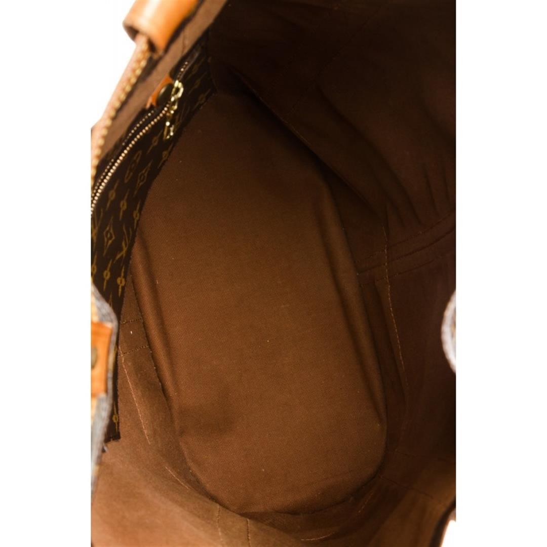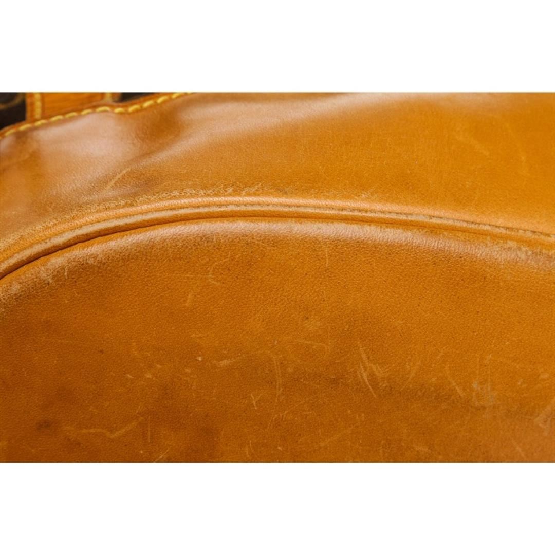 Brown and tan monogram coated canvas Louis Vuitton Randonne backpack with brass hardware, tan vachetta leather trim featuring yellow contrast stitching, dual flat shoulder straps, brown woven interior lining and open top. Item is pre-owned.
