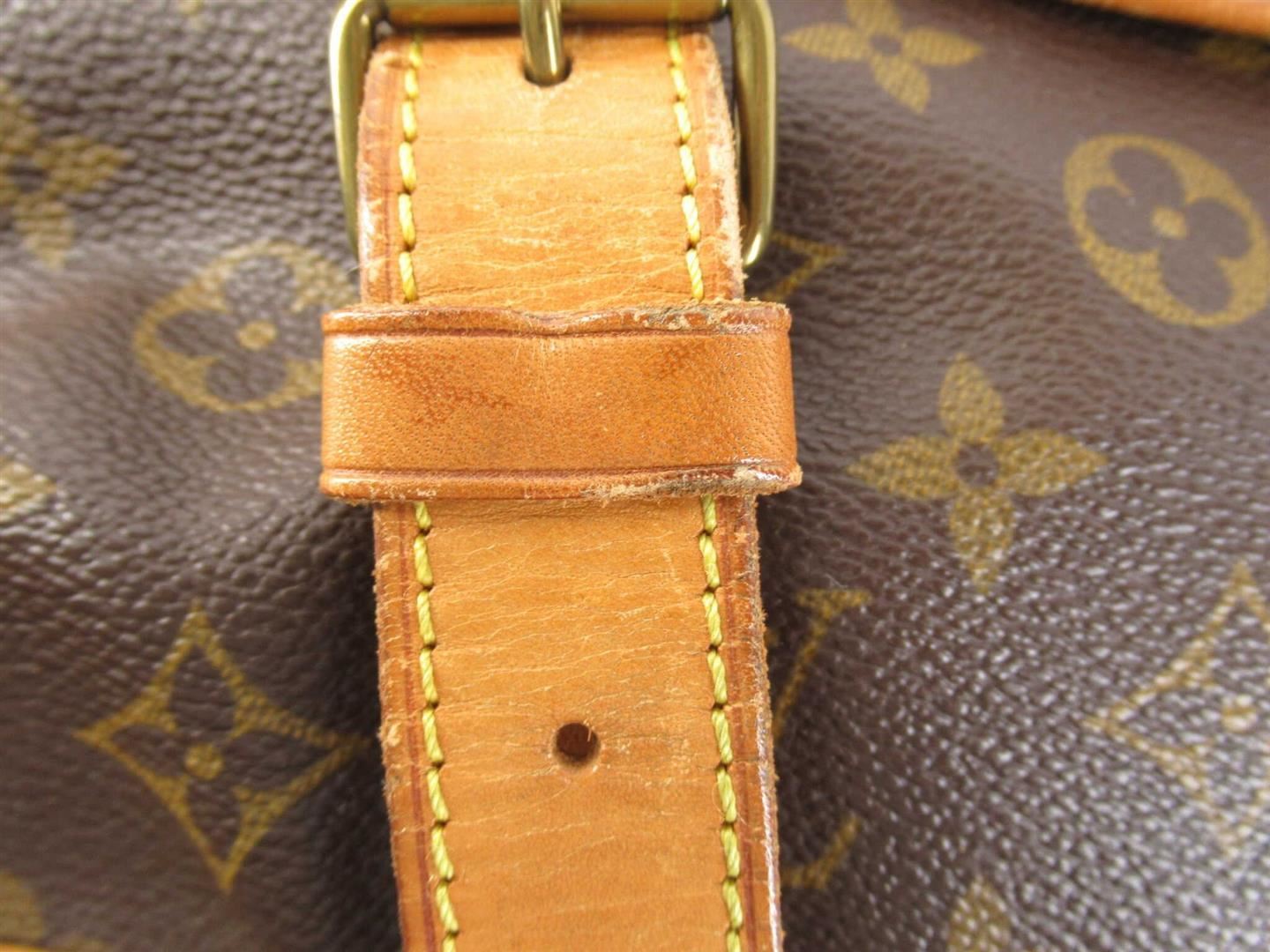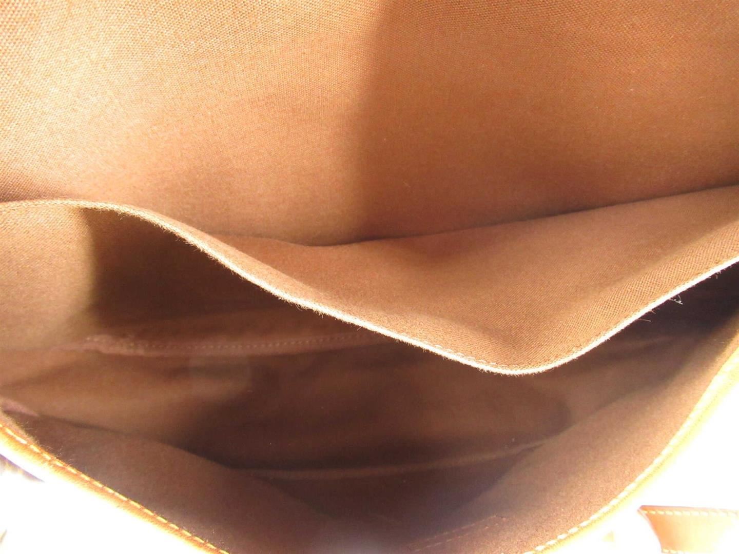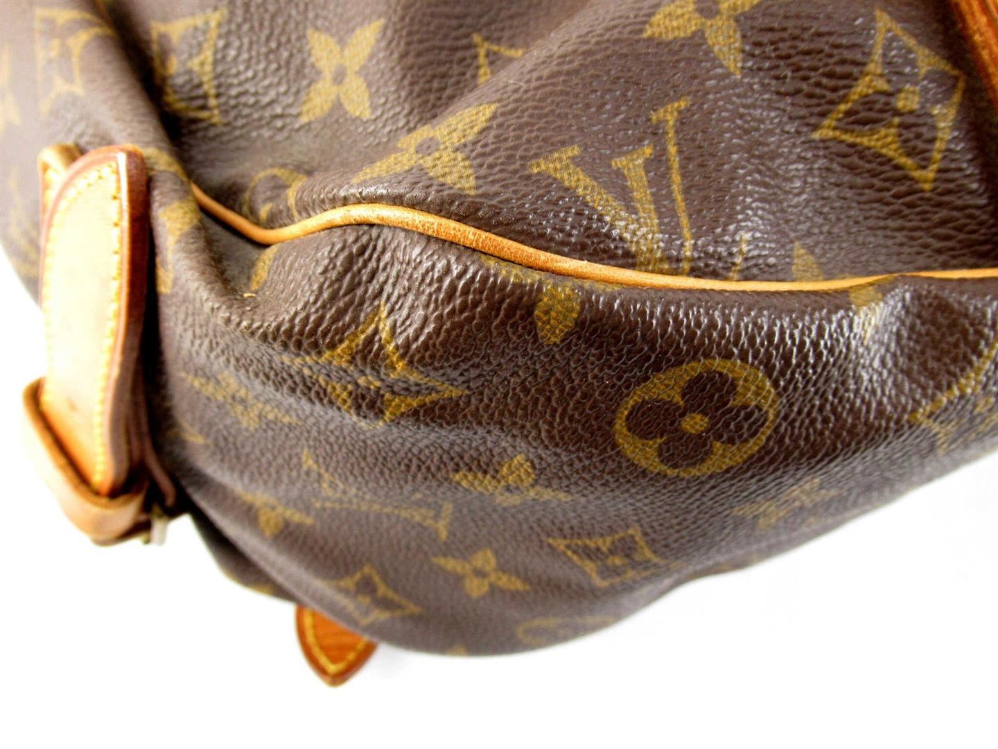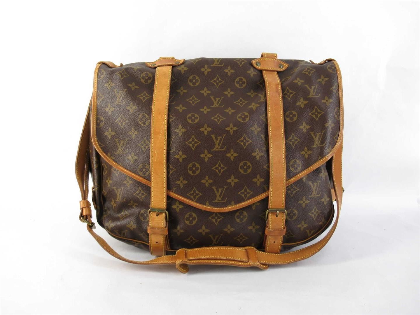 Brown and tan monogram coated canvas Louis Vuitton Saumur 43 brass hardware, tan vachetta leather accents, adjustable flat shoulder strap, brown canvas interior, dual interior compartments, three pockets at interior walls and four buckle closures at exter