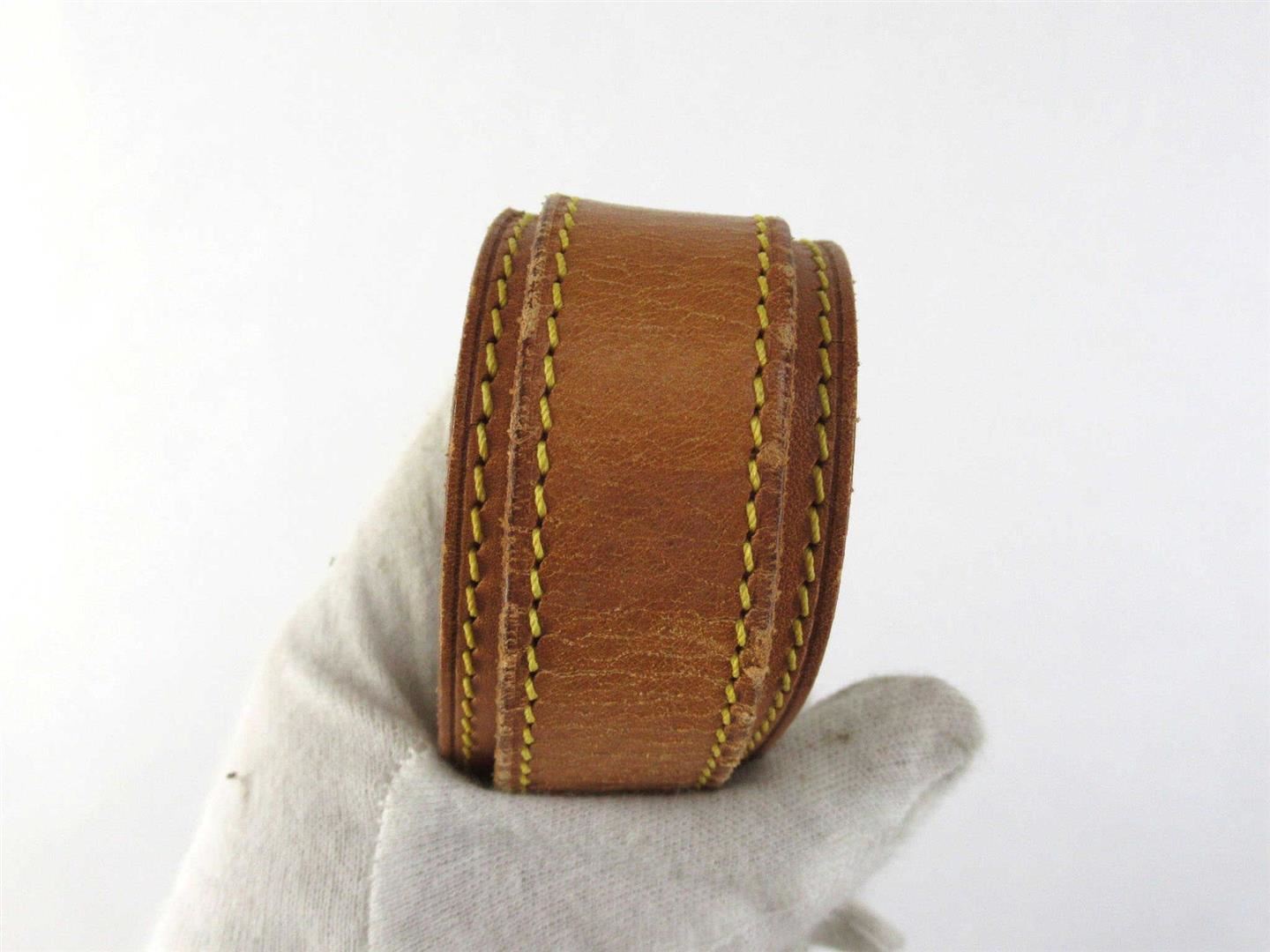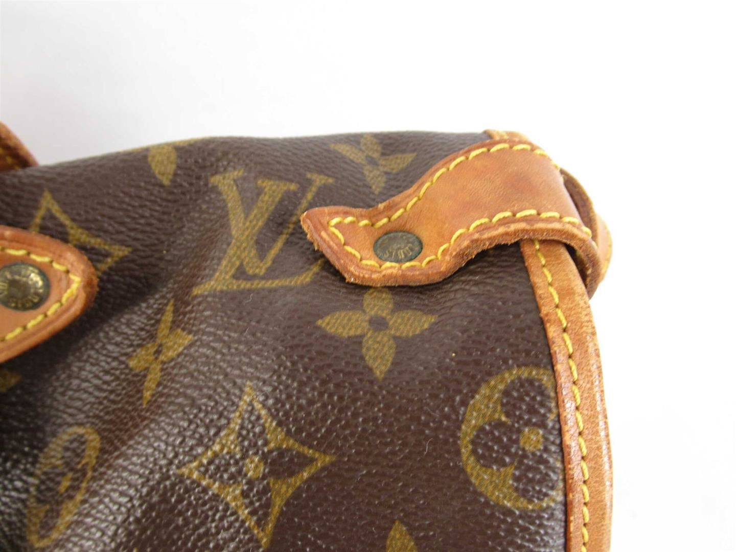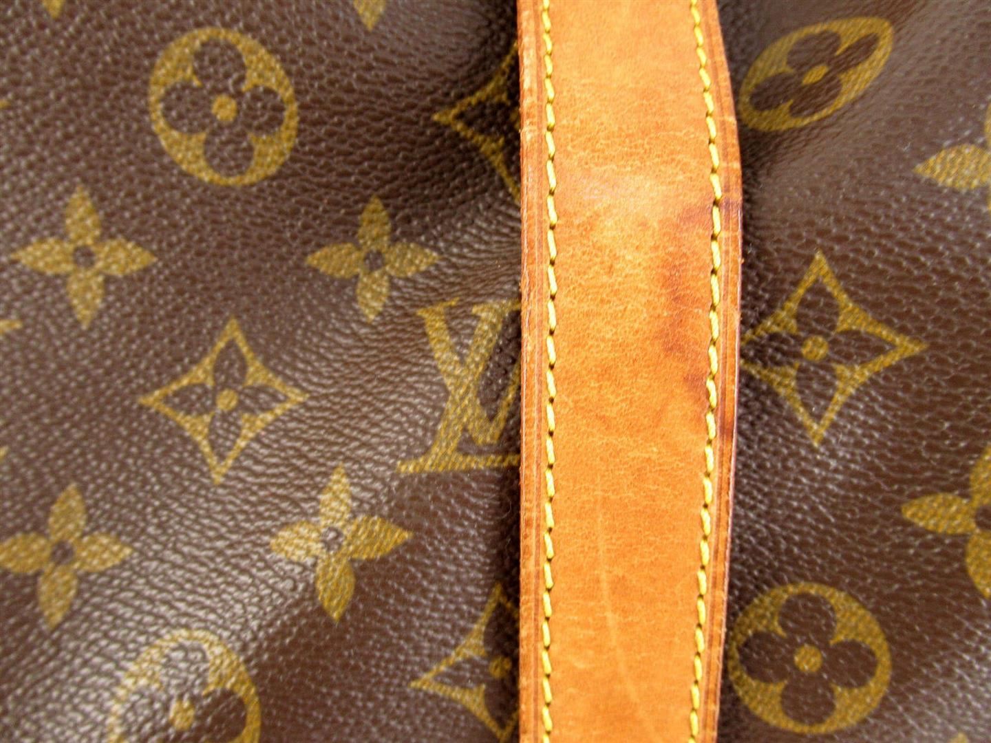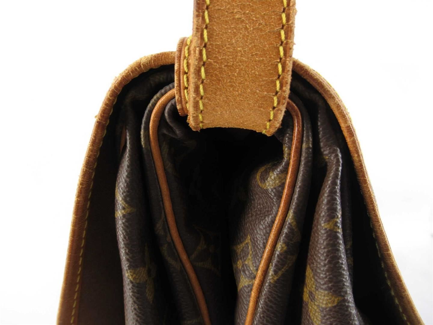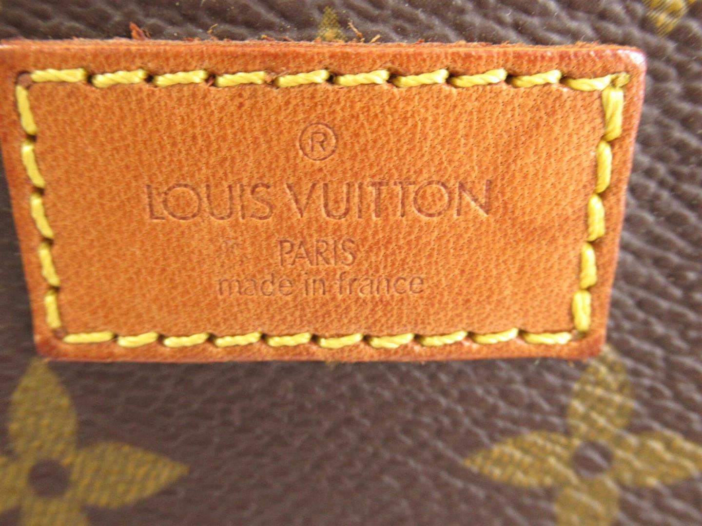 Brown and tan monogram coated canvas Louis Vuitton Saumur 43 brass hardware, tan vachetta leather accents, adjustable flat shoulder strap, brown canvas interior, dual interior compartments, three pockets at interior walls and four buckle closures at exter