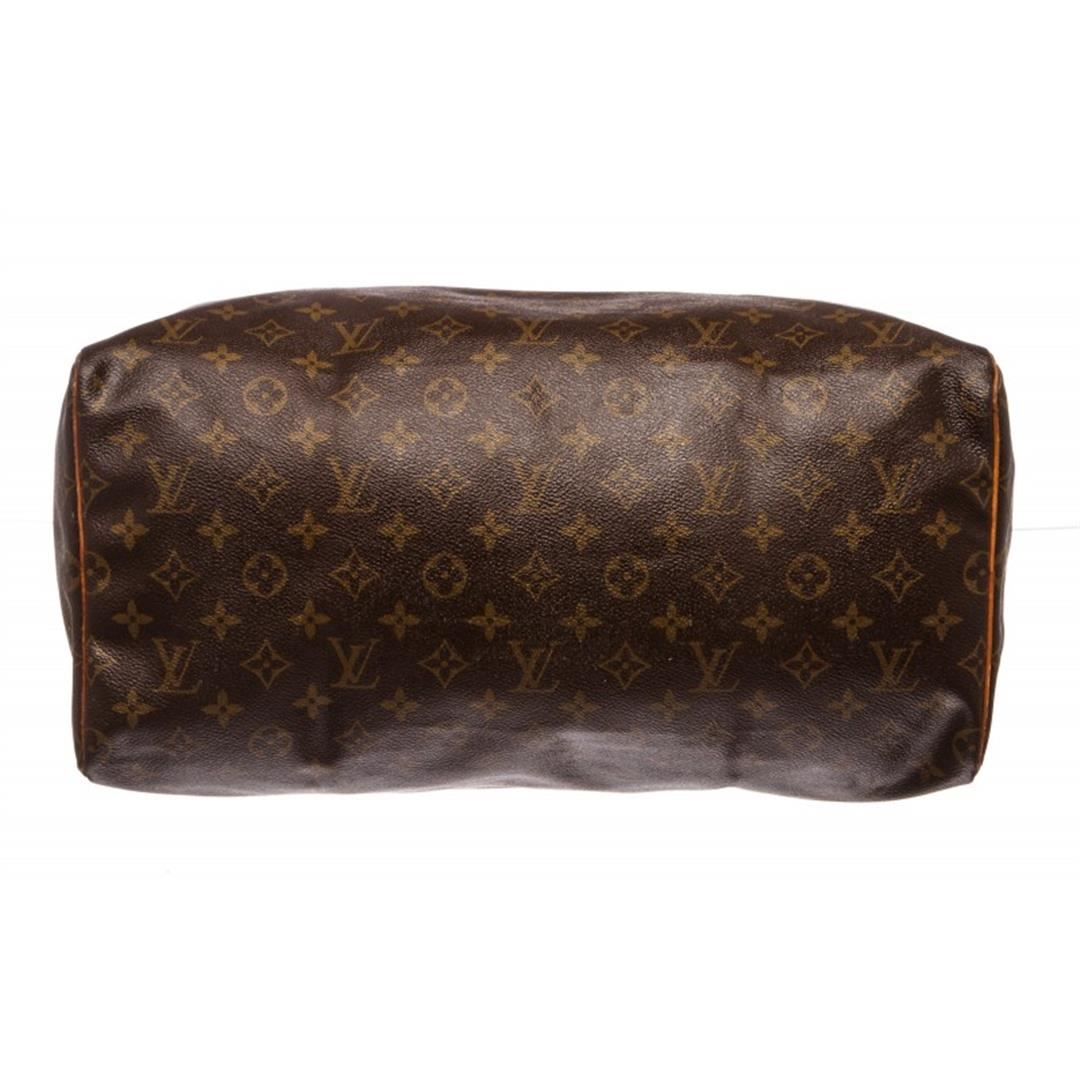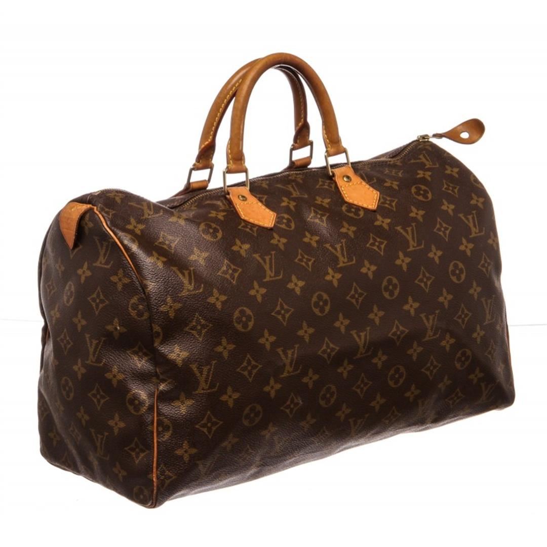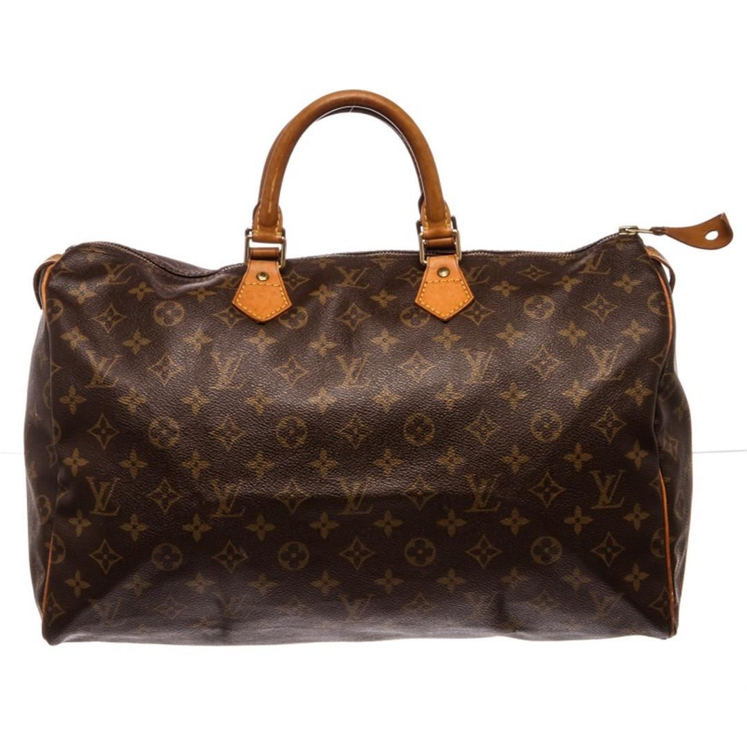 Brown and tan monogram coated canvas Louis Vuitton Speedy 40 with brass hardware, tan vachetta leather accents, dual rolled top handles, brown canvas lining, single pocket at interior wall and zip closure at top. Item is Pre-Owned.
