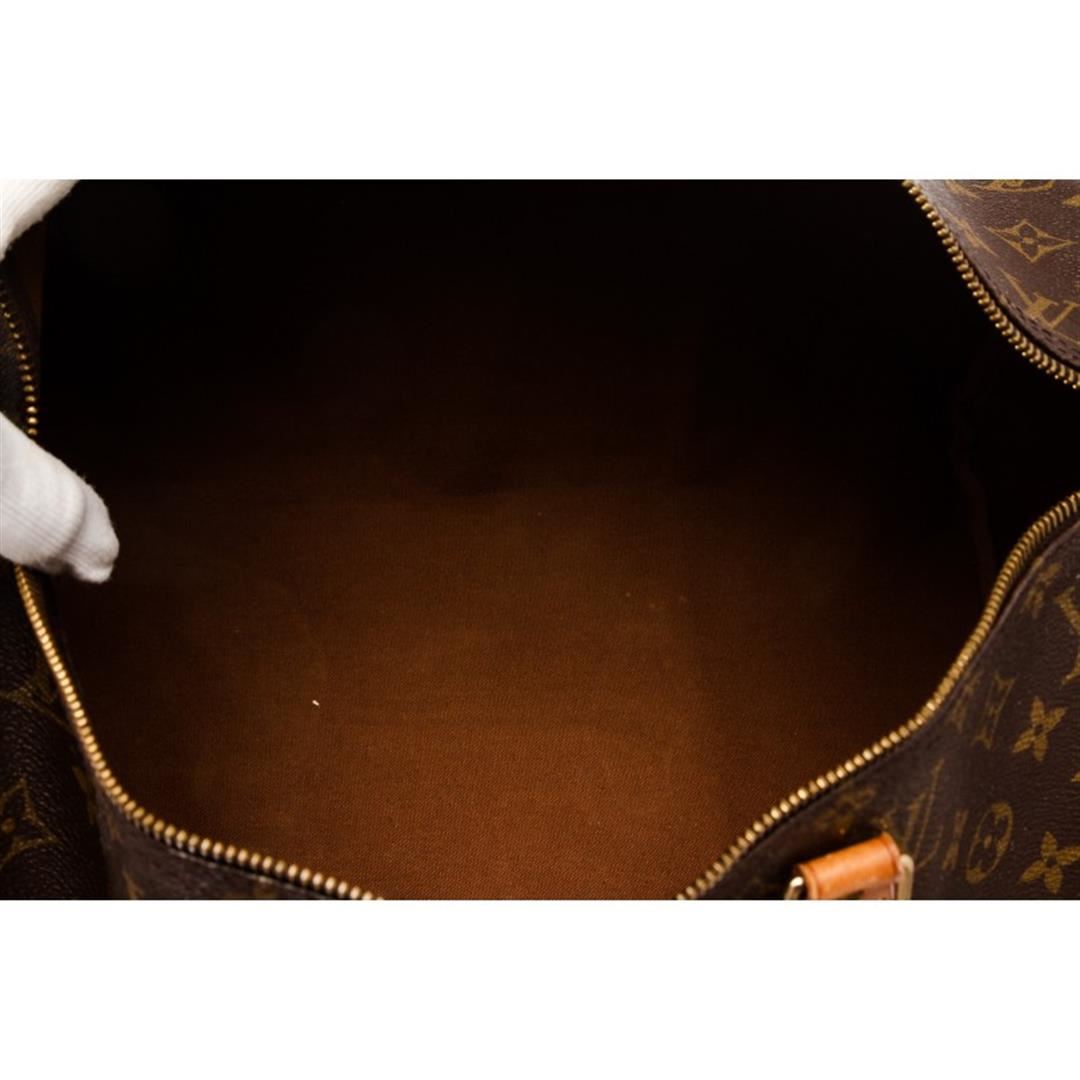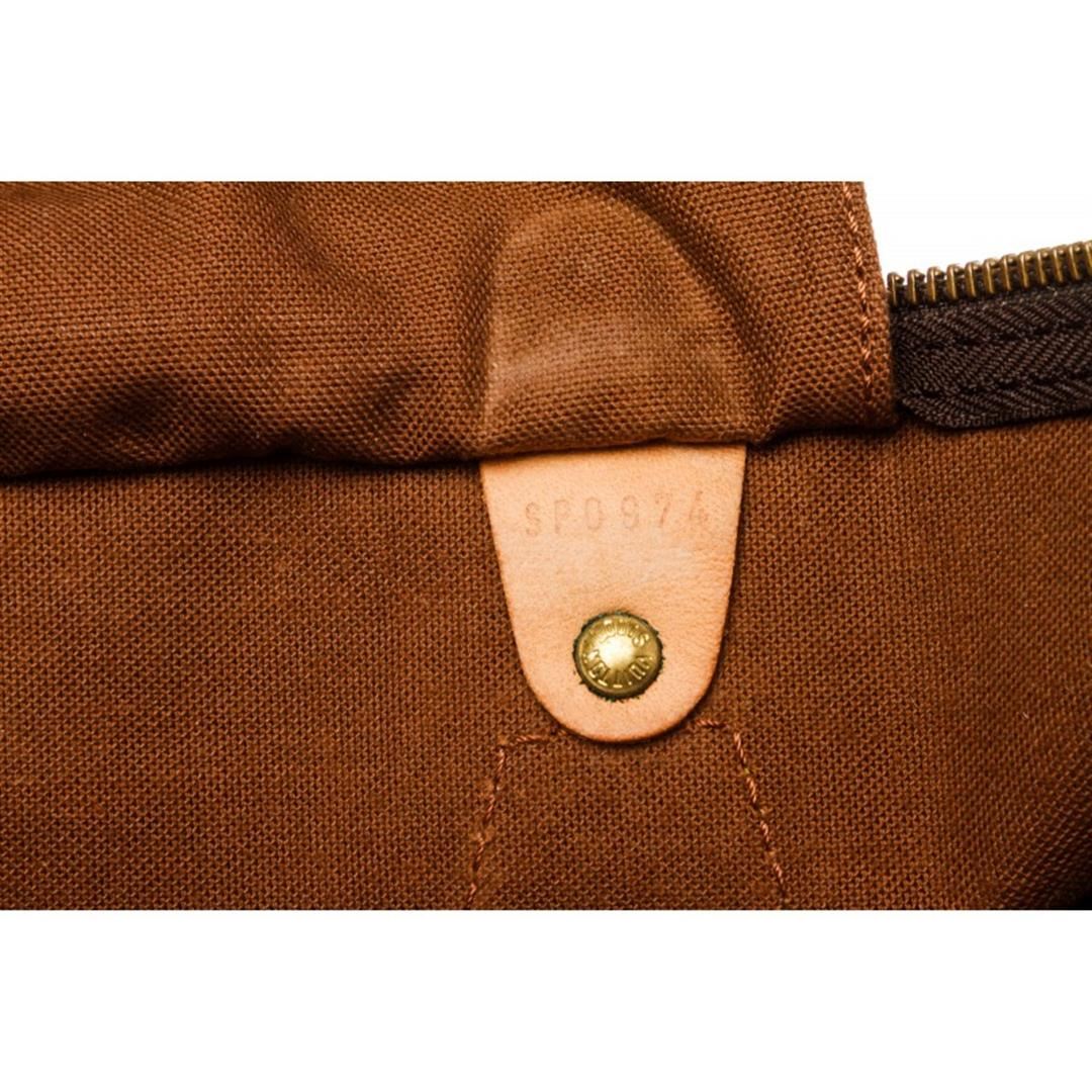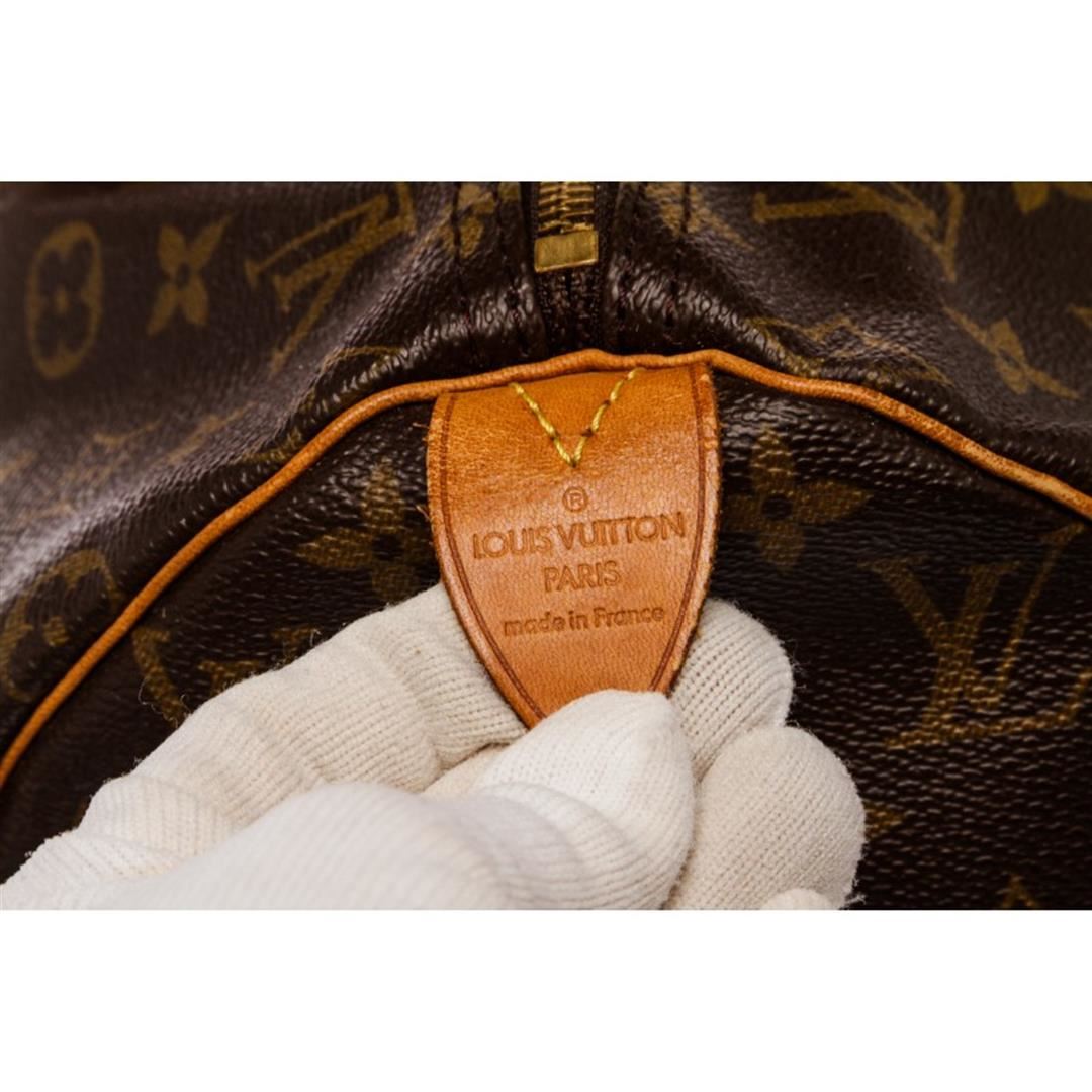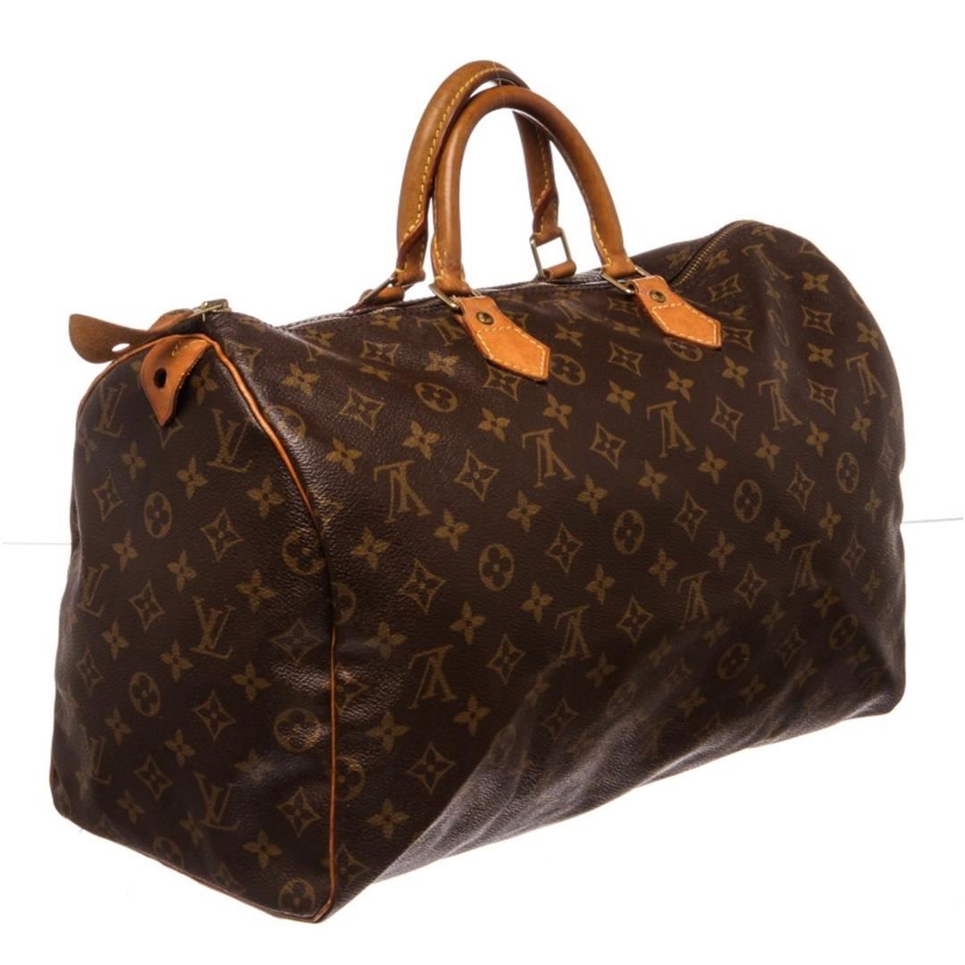 Brown and tan monogram coated canvas Louis Vuitton Speedy 40 with brass hardware, tan vachetta leather accents, dual rolled top handles, brown canvas lining, single pocket at interior wall and zip closure at top. Item is Pre-Owned.