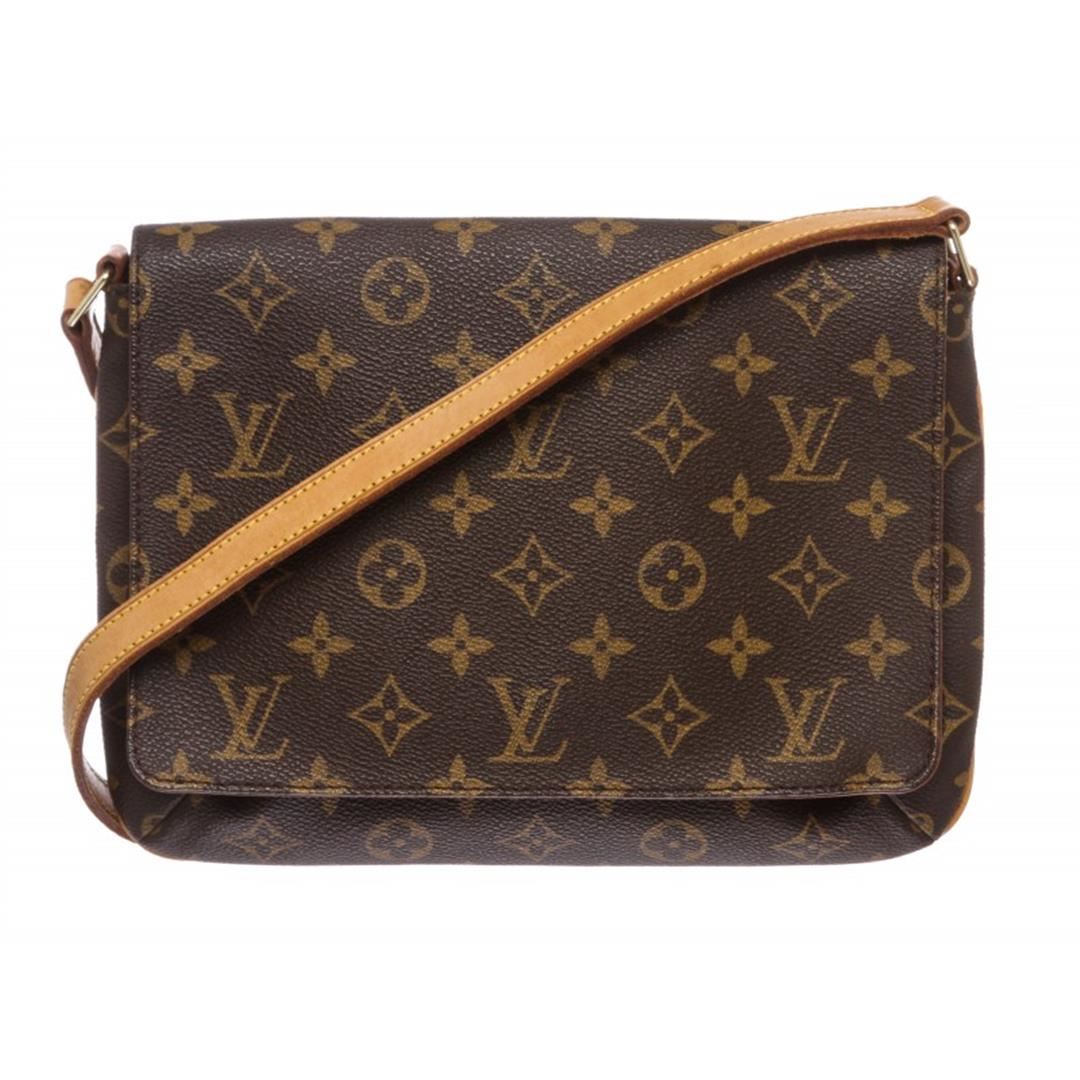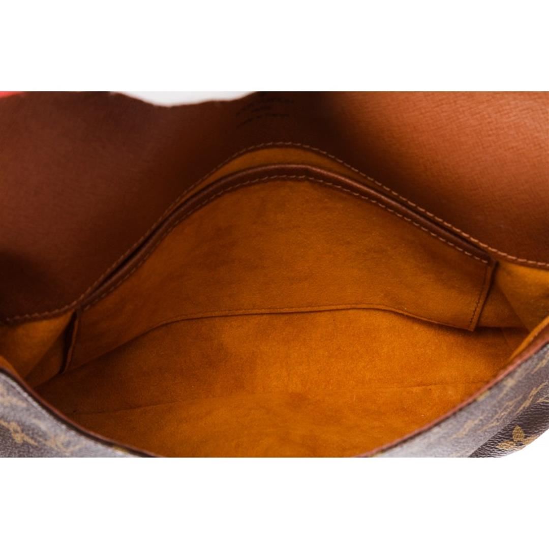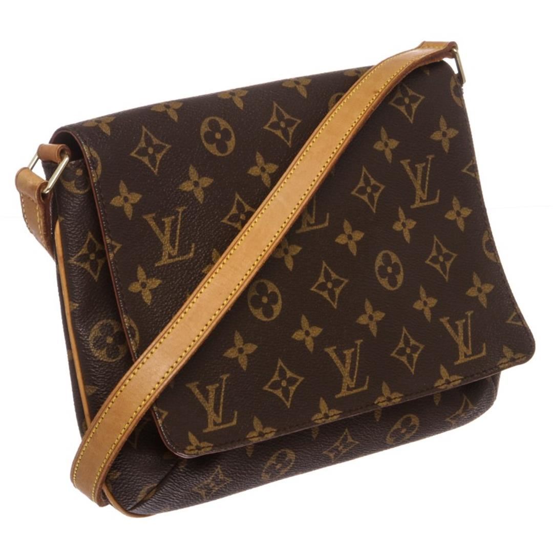 Brown and tan monogram coated canvas Louis Vuitton Musette Tango bag with brass hardware, tan vachetta leather trim, single flat shoulder strap, marigold Alcantara lining, single pocket at interior wall and magnetic snap closure at front flap.