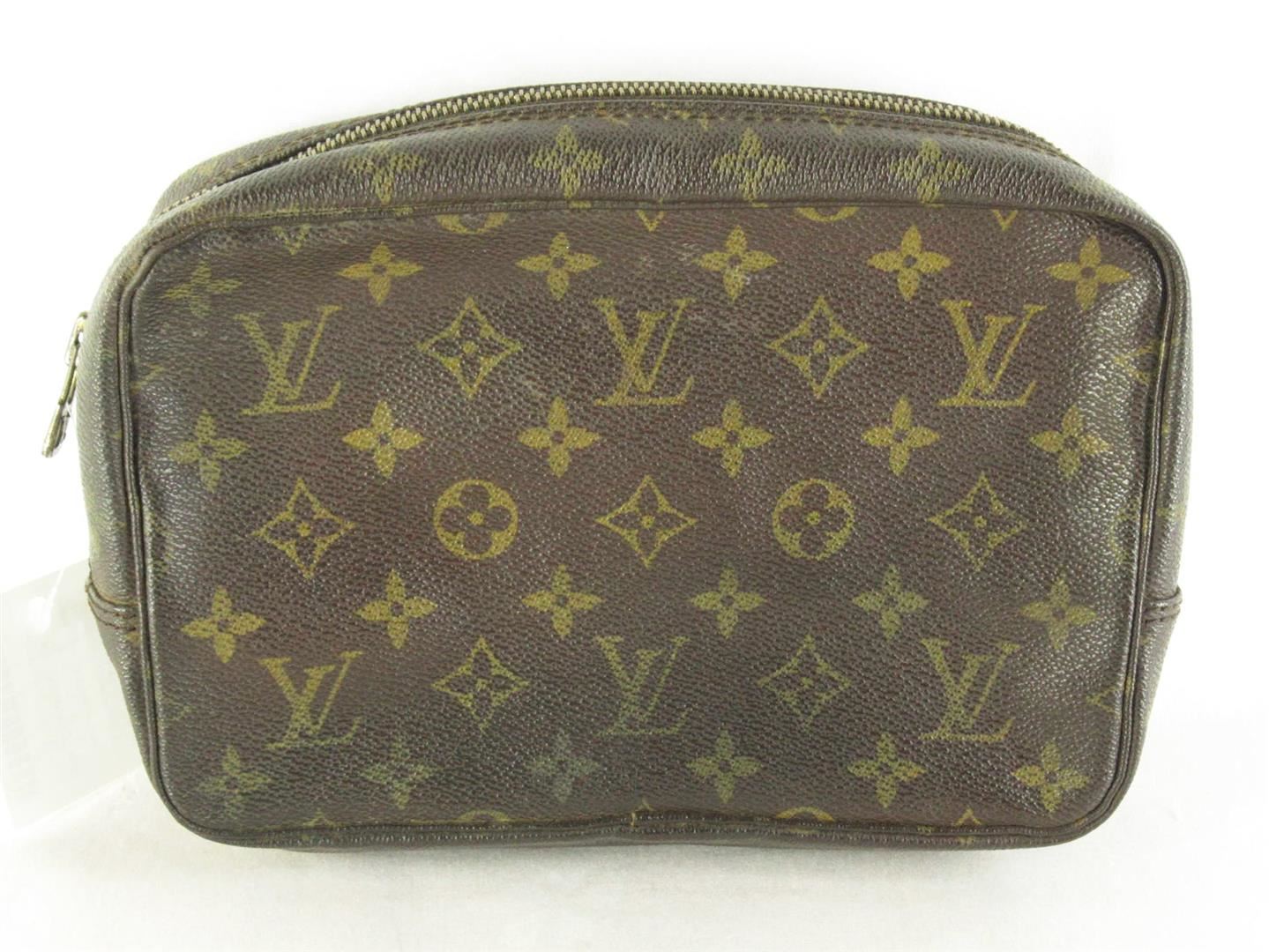 Brown and tan monogram coated canvas Louis Vuitton Toiletry MM with brass hardware, creme coated canvas lining, single slit pocket, three elasticized straps and zip-around closure at top.