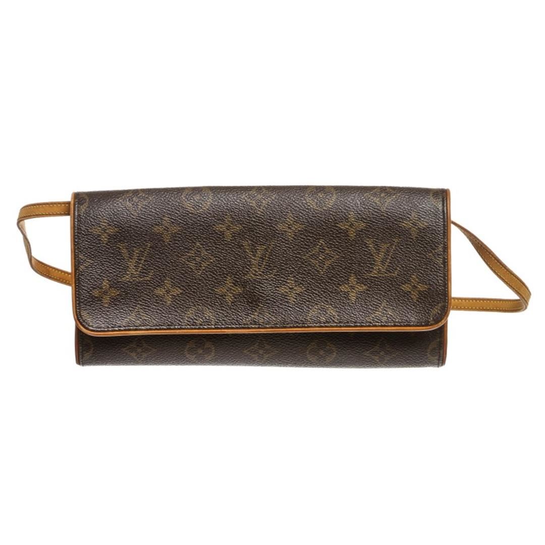 Brown and tan monogram coated canvas Louis Vuitton Pochette Twin GM with brass hardware, tan vachetta leather accents throughout, optional shoulder strap, beige Alcantara lining, single pocket at interior wall and flap with magnetic snap closure at front. Detachable Strap.