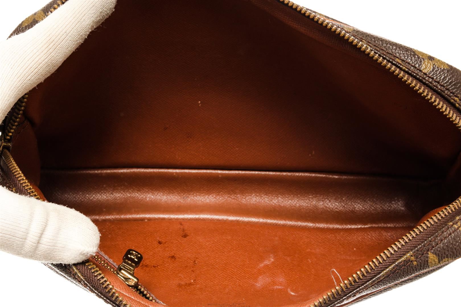 Louis Vuitton Monogram Marly Dragonne. All available information is listed in the description and shown in the photos. Louis Vuitton Monogram Marly Dragonne with coated canvas exterior, brown leather lining, wrist strap, gold-tone hardware, zipper closure, and one main compartment with one zip pocket.
