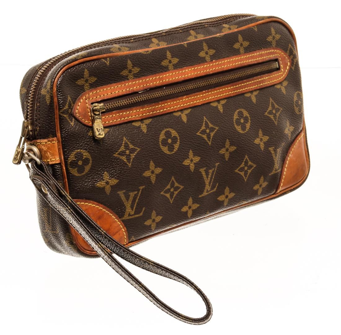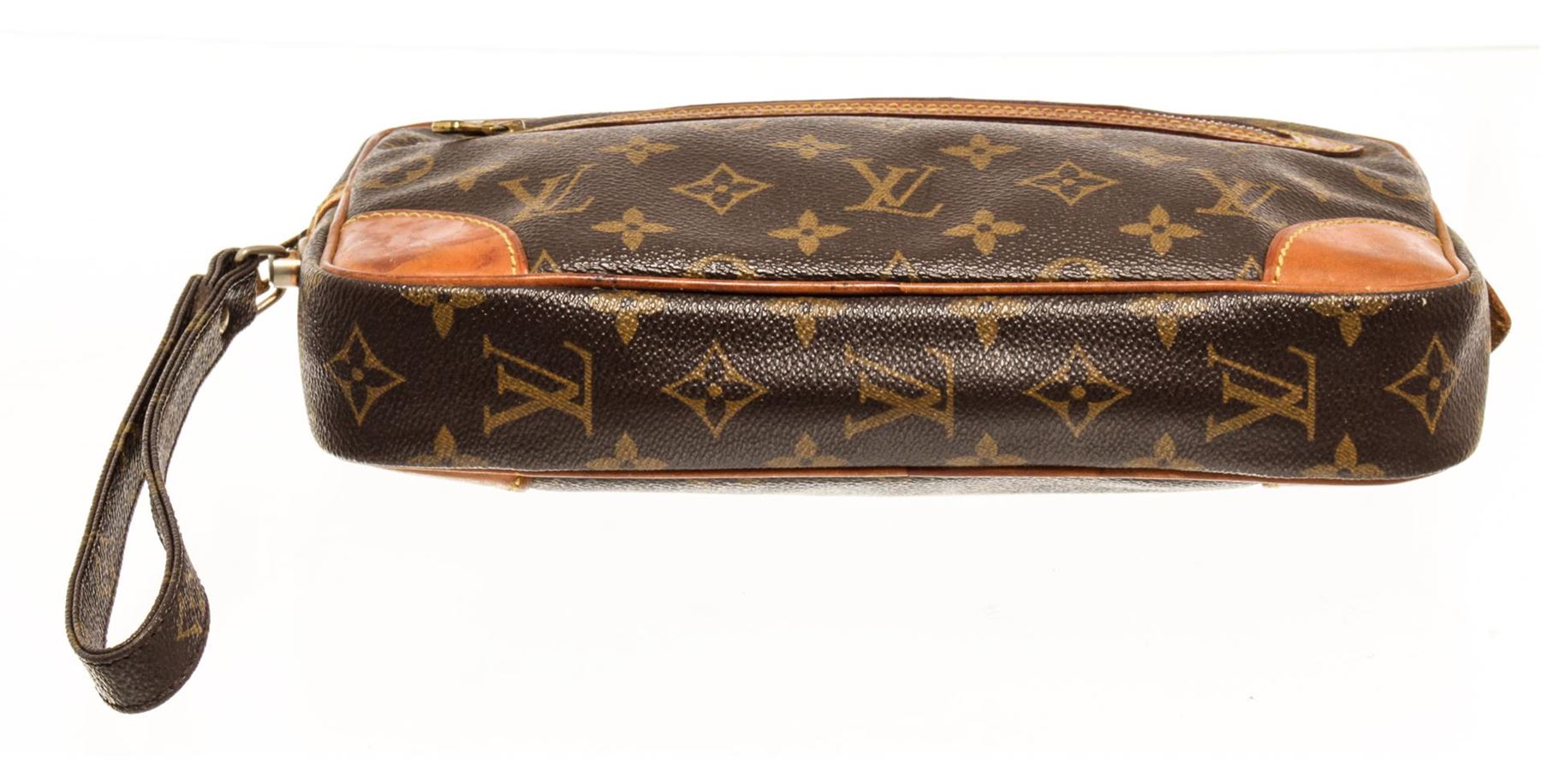 Louis Vuitton Monogram Marly Dragonne. All available information is listed in the description and shown in the photos. Louis Vuitton Monogram Marly Dragonne with coated canvas exterior, brown leather lining, wrist strap, gold-tone hardware, zipper closure, and one main compartment with one zip pocket.