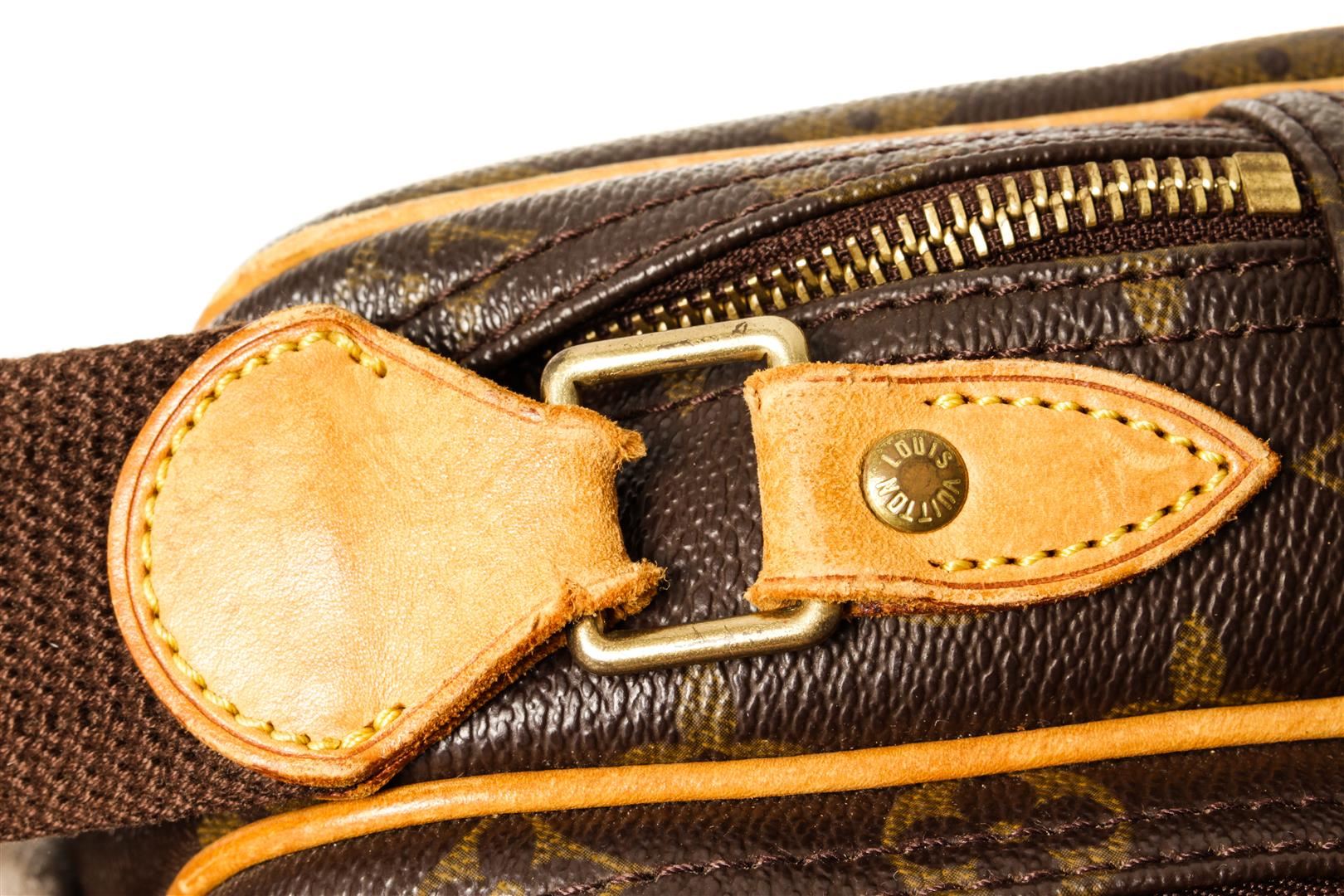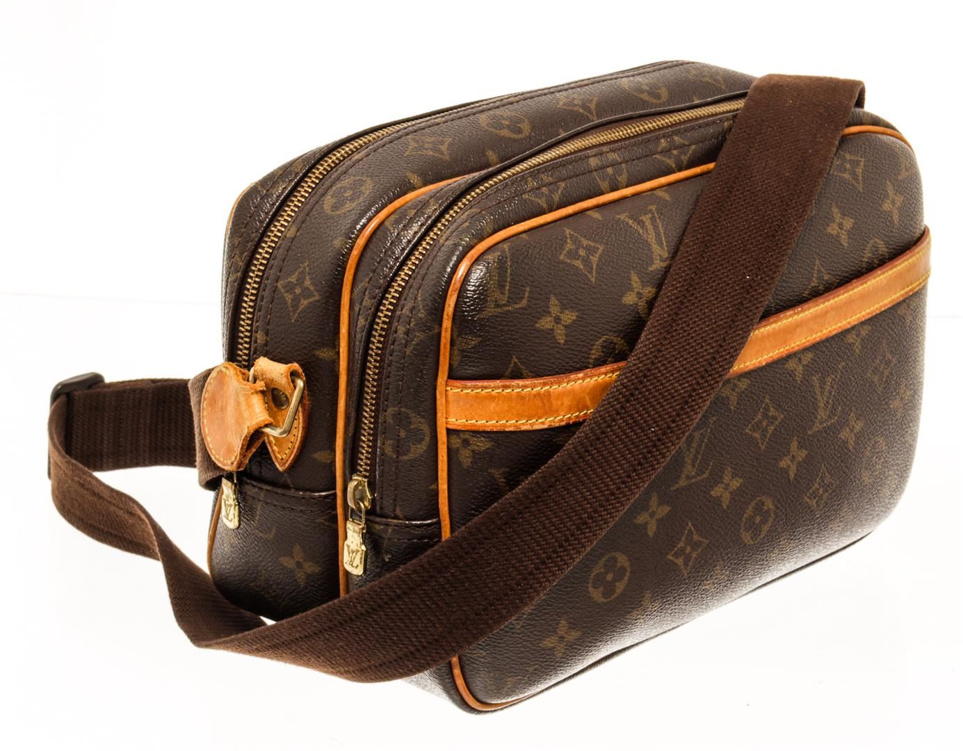 One Louis Vuitton Monogram Reporter PM Shoulder Bag. Item is sold AS-IS. All available information is listed in the description and shown in the photo. Louis Vuitton Monogram Reporter PM shoulder bag with coated canvas exterior, beige fabric lining, adjustable fabric strap, contrasting vachetta leather trims, gold-tone hardware, zipper closure, and one main compartment.