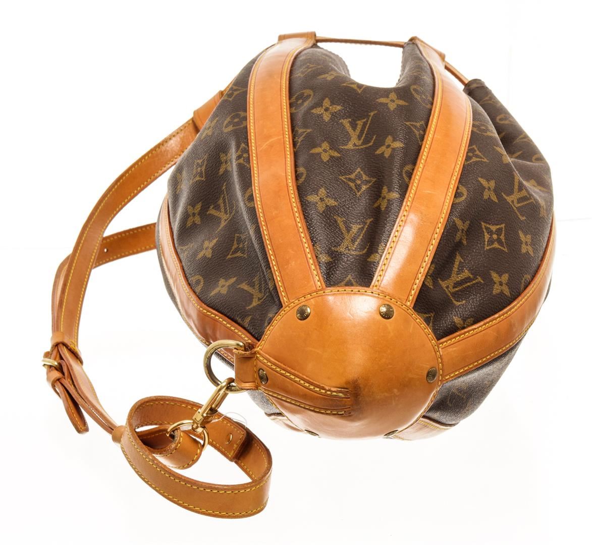 One Louis Vuitton Monogram Romeo Gigli Shoulder Bag. Item is sold AS-IS. All available information is listed in the description and shown in the photo. Louis Vuitton Monogram Romeo Gigli shoulder bag with brown coated canvas exterior, brown fabric lining, contrasting vachetta leather adjustable straps and trims, gold-tone hardware, drawstring closure, and one main compartment.