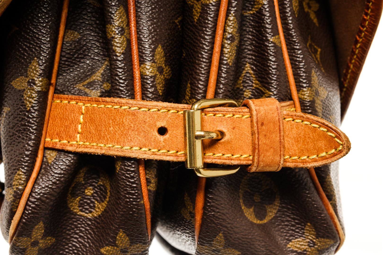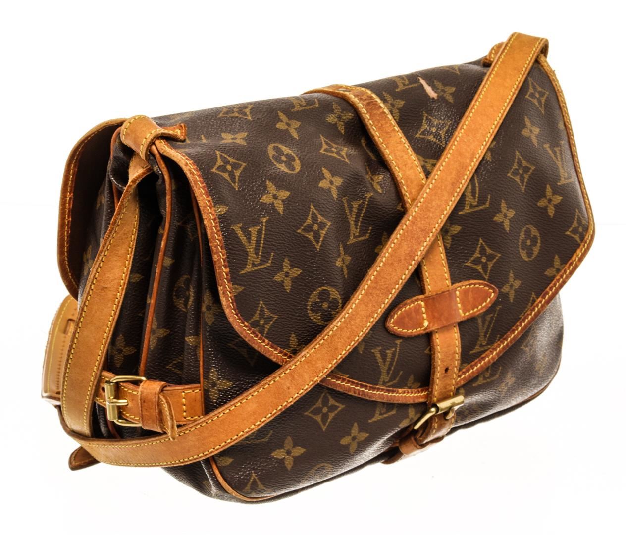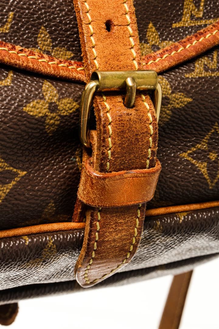 One Louis Vuitton Monogram Saumur 30 Shoulder Bag. Item is sold AS-IS. All available information is listed in the description and shown in the photo. Louis Vuitton Monogram Saumur 30 shoulder bag with coated canvas exterior, brown fabric lining, contrasting vachetta leather trims and adjustable strap, flap and buckle closure, gold-tone hardware, and two main compartments, one on each side.