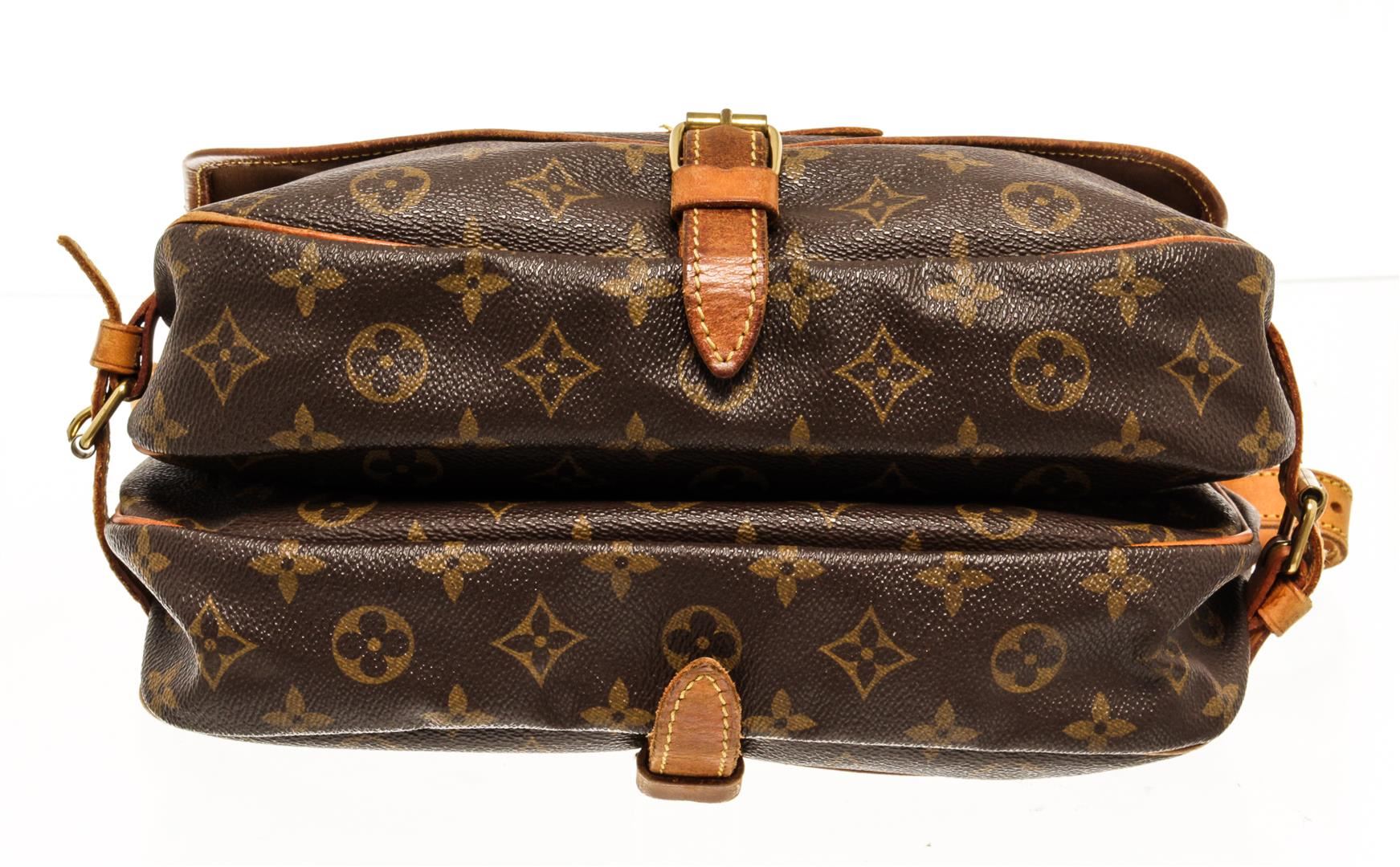One Louis Vuitton Monogram Saumur 30 Shoulder Bag. Item is sold AS-IS. All available information is listed in the description and shown in the photo. Louis Vuitton Monogram Saumur 30 shoulder bag with coated canvas exterior, brown fabric lining, contrasting vachetta leather trims and adjustable strap, flap and buckle closure, gold-tone hardware, and two main compartments, one on each side.