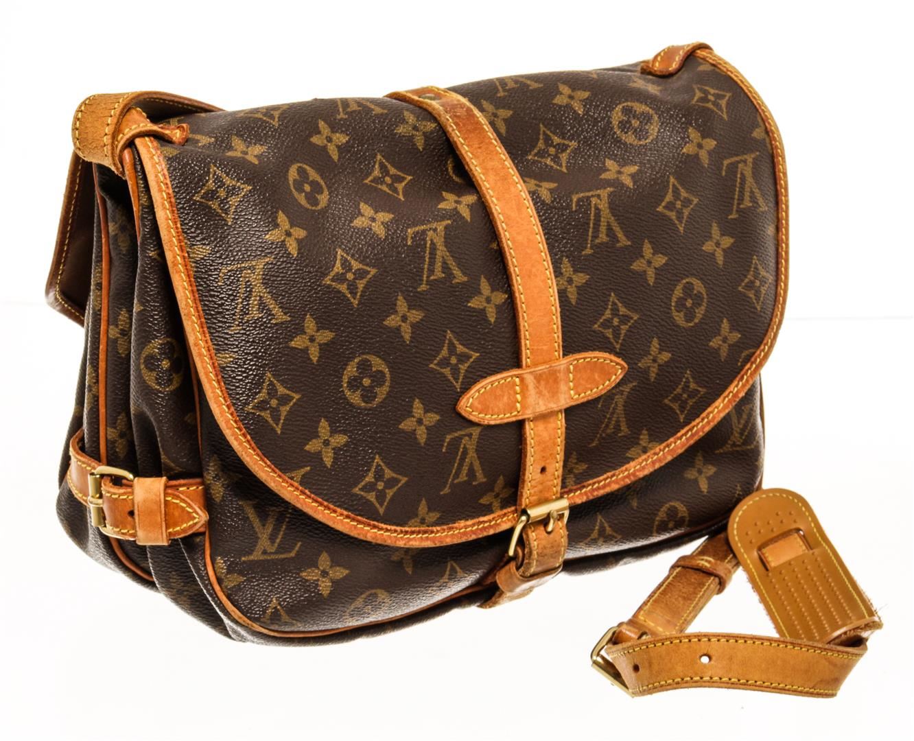 One Louis Vuitton Monogram Saumur 30 Shoulder Bag. Item is sold AS-IS. All available information is listed in the description and shown in the photo. Louis Vuitton Monogram Saumur 30 shoulder bag with coated canvas exterior, brown fabric lining, contrasting vachetta leather trims and adjustable strap, flap and buckle closure, gold-tone hardware, and two main compartments, one on each side.