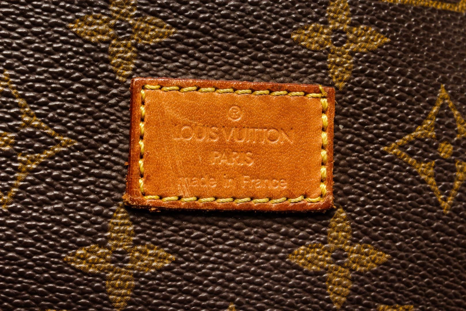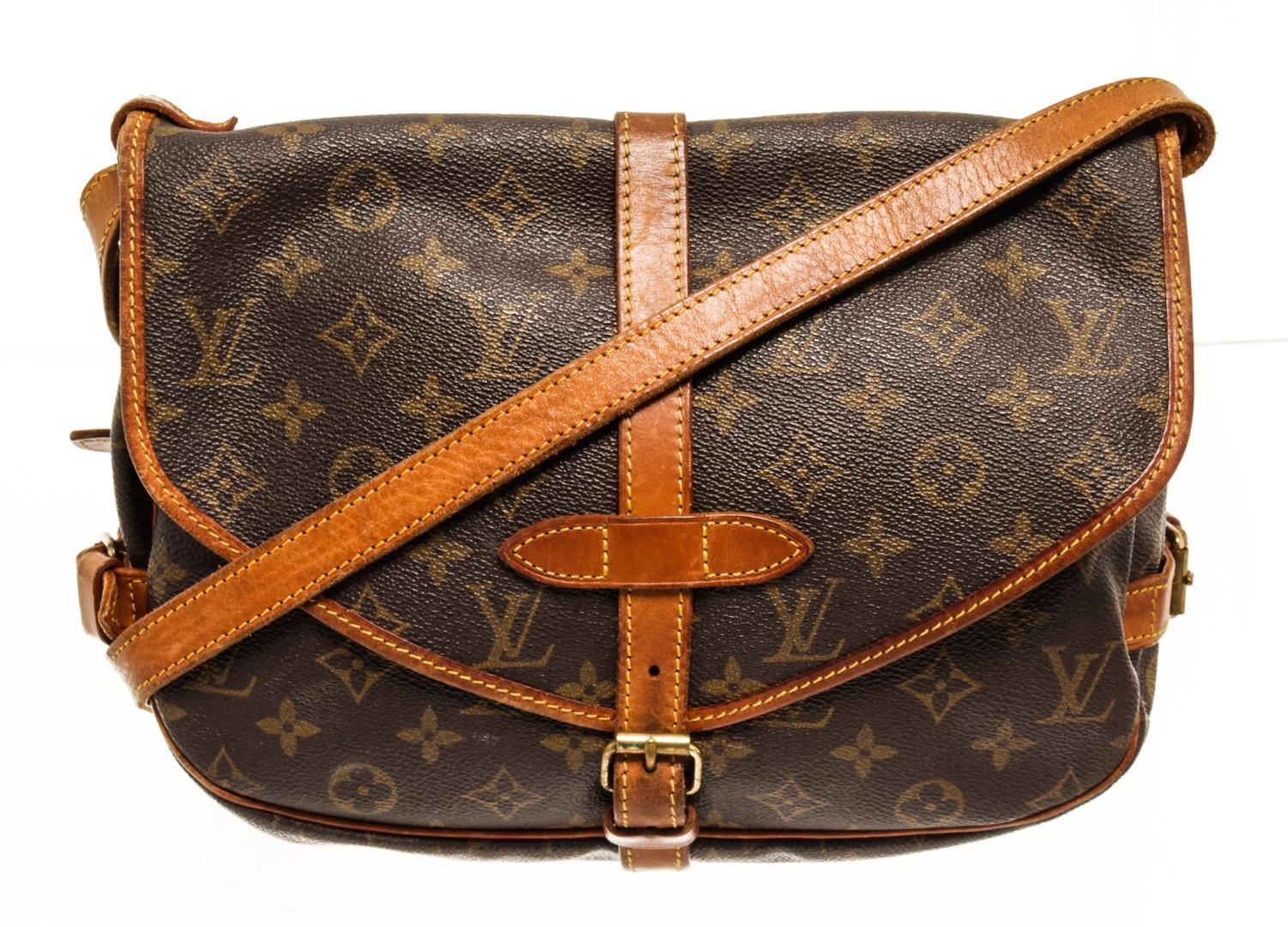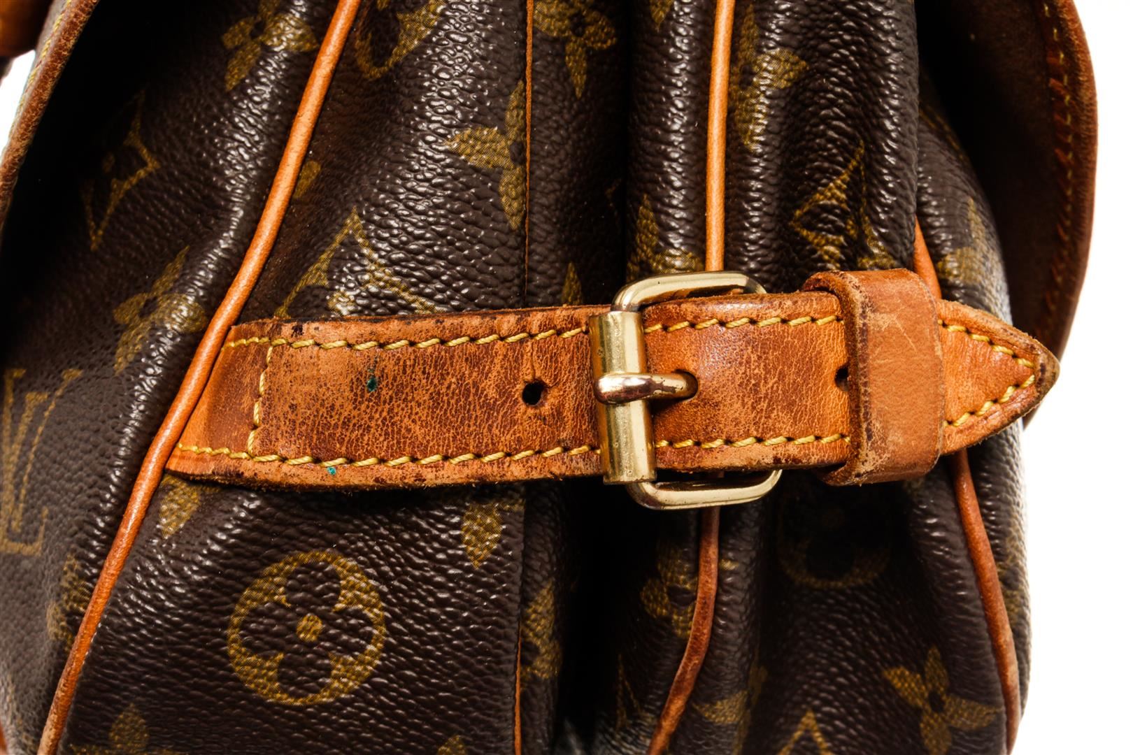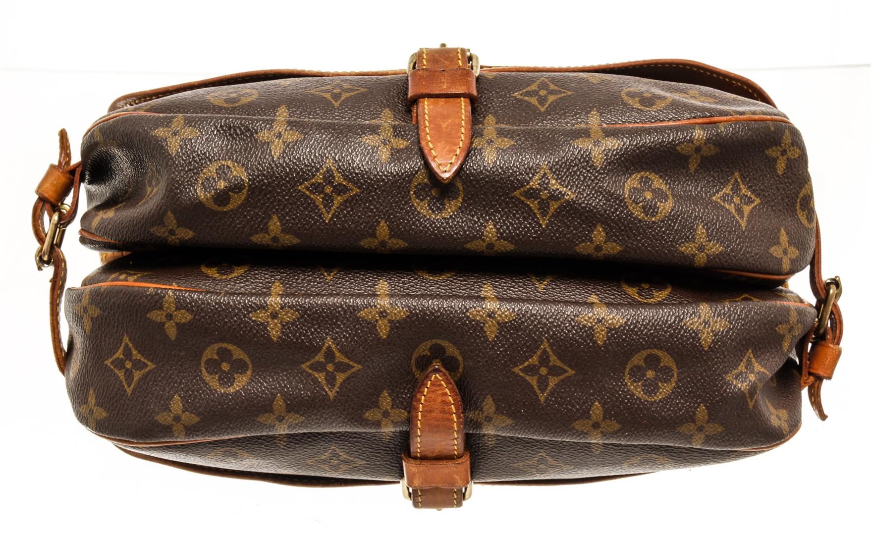 One Louis Vuitton Monogram Saumur 30. Item is sold AS-IS. All available information is listed in the description and shown in the photo. Louis Vuitton Monogram Saumur 30 with coated canvas exterior, brown fabric lining, contrasting vachetta leather trims and adjustable strap, flap and buckle closure, gold-tone hardware, and two main compartments, one on each side.