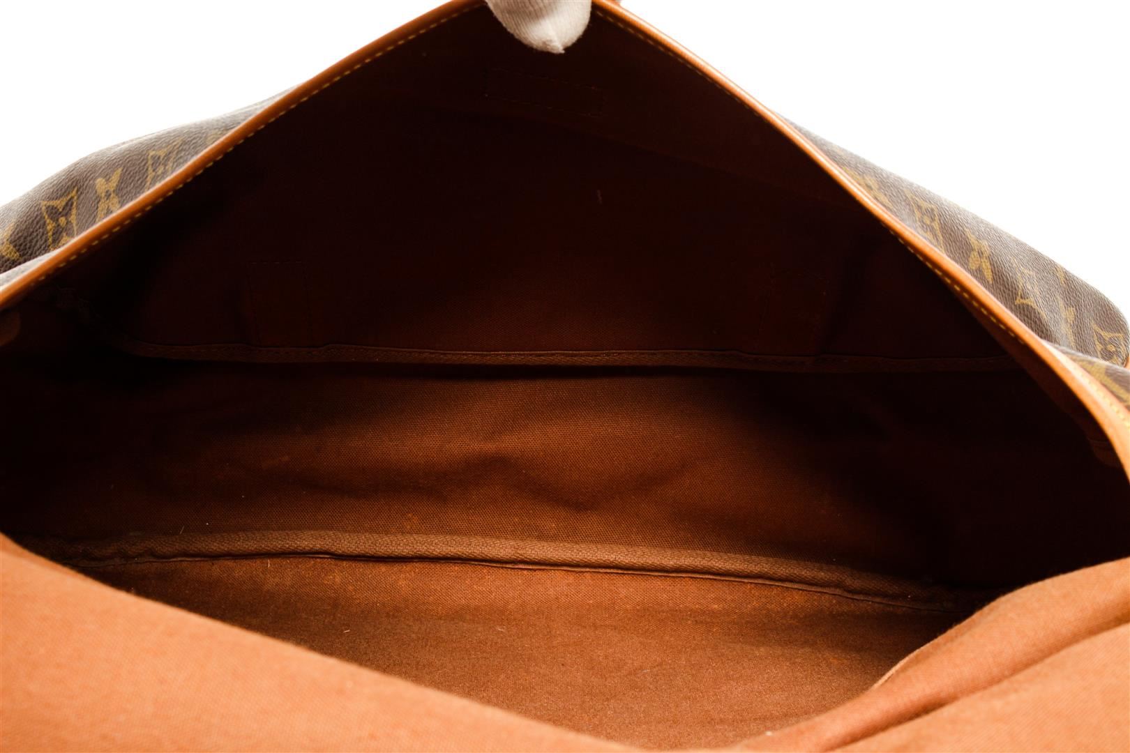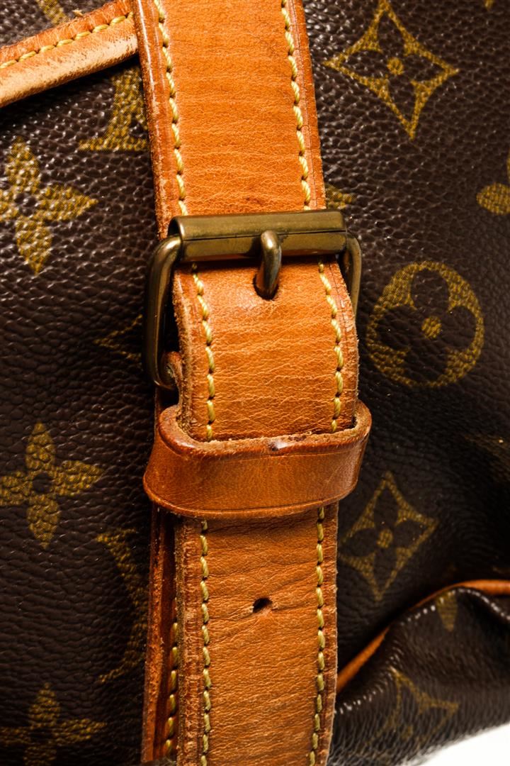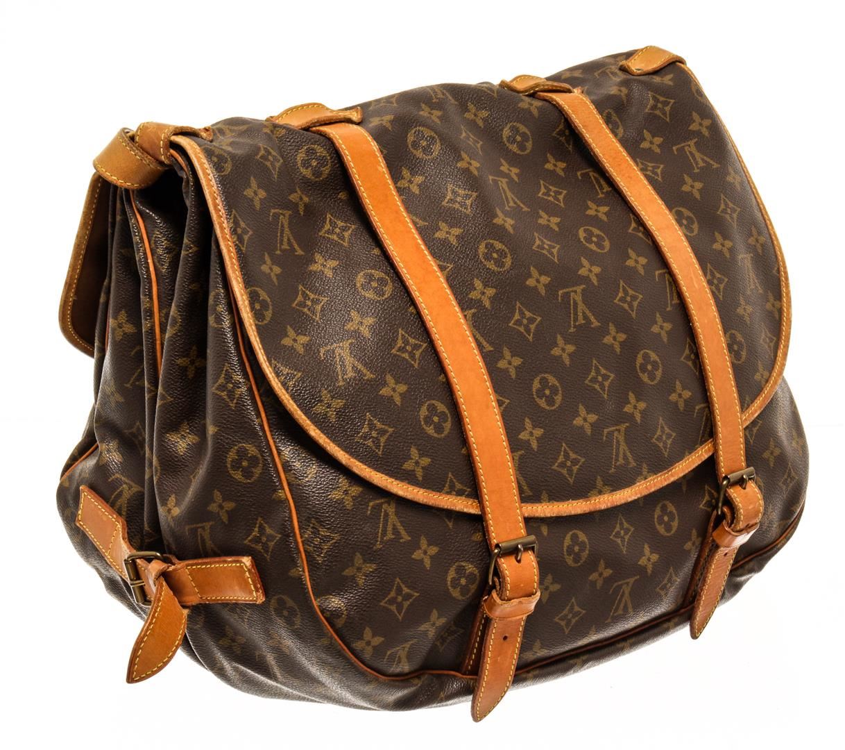 One Louis Vuitton Monogram Saumur 43 Shoulder Bag. Item is sold AS-IS. All available information is listed in the description and shown in the photo. Louis Vuitton Monogram Saumur 43 shoulder bag with coated canvas exterior, brown fabric lining, contrasting vachetta leather trims and adjustable strap; gold-tone hardware, flap and buckle closure; and two main compartments, one on each side.