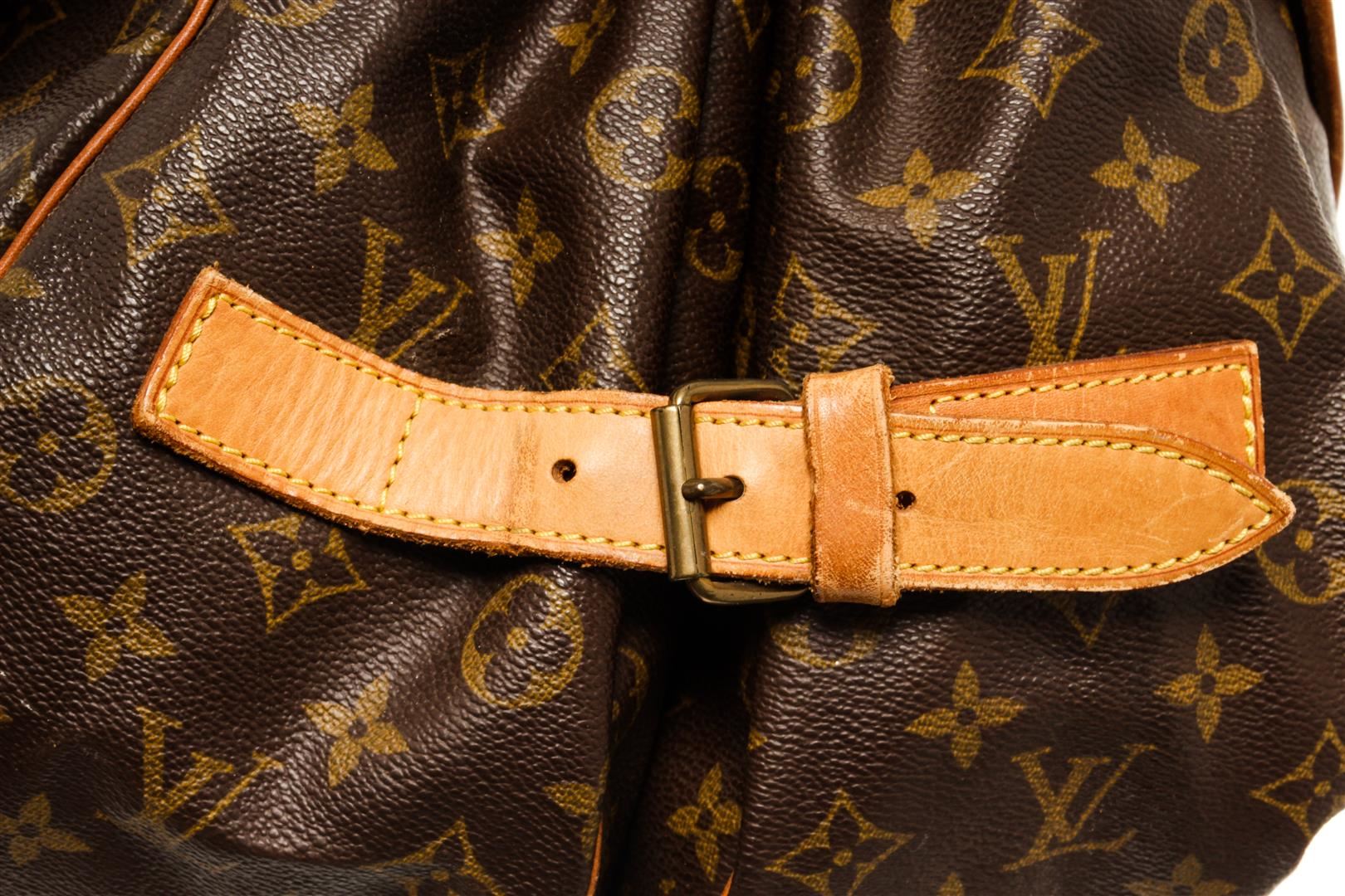 One Louis Vuitton Monogram Saumur 43 Shoulder Bag. Item is sold AS-IS. All available information is listed in the description and shown in the photo. Louis Vuitton Monogram Saumur 43 shoulder bag with coated canvas exterior, brown fabric lining, contrasting vachetta leather trims and adjustable strap; gold-tone hardware, flap and buckle closure; and two main compartments, one on each side.