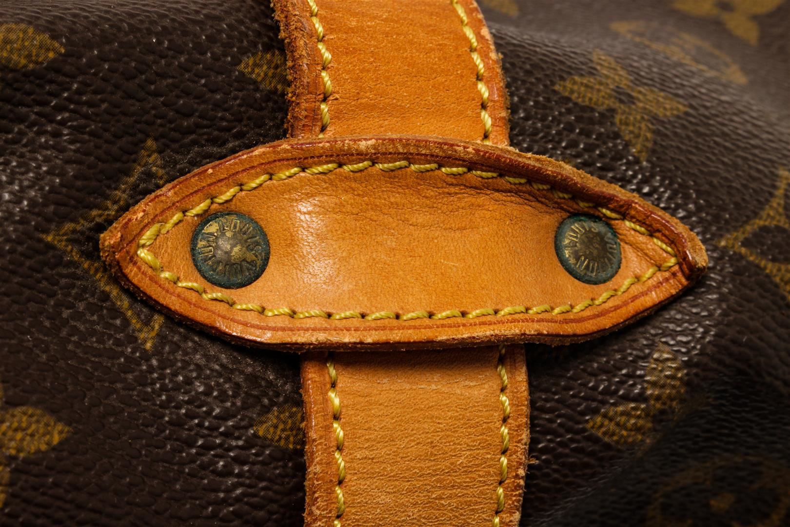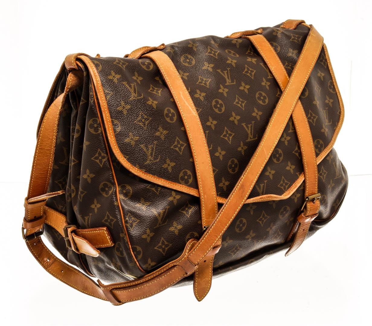 One Louis Vuitton Monogram Saumur 43 Shoulder Bag. Item is sold AS-IS. All available information is listed in the description and shown in the photo. Louis Vuitton Monogram Saumur 43 shoulder bag with coated canvas exterior, brown fabric lining, contrasting vachetta leather trims and adjustable strap; gold-tone hardware, flap and buckle closure; and two main compartments, one on each side.