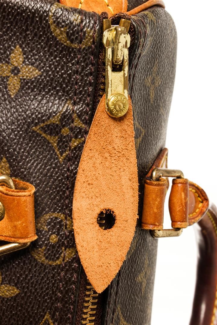 One Louis Vuitton Monogram Speedy 25 Handbag. Item is sold AS-IS. All available information is listed in the description and shown in the photo. Louis Vuitton Monogram 25 handbag with brown coated canvas exterior, brown fabric lining, contrasting vachetta leather trims and top handles, gold-tone hardware, zipper closure, and one main compartment with one slip pocket. There is a stain in the canvas lining as shown in pictures!