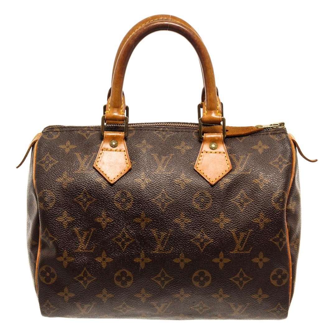 One Louis Vuitton Monogram Speedy 25 Handbag. Item is sold AS-IS. All available information is listed in the description and shown in the photo. Louis Vuitton Monogram Speedy 25 handbag with coated canvas exterior, brown fabric lining, contrasting vachetta leather top handle, gold-tone hardware, zipper closure, one main compartment with one slip pocket.