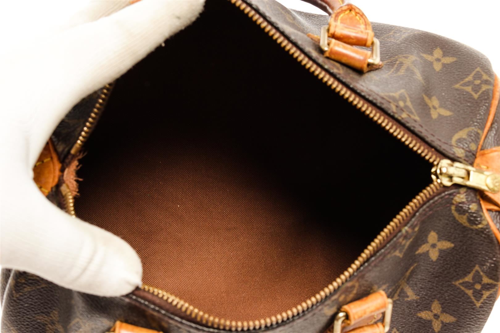 One Louis Vuitton Monogram Speedy 25 Handbag. Item is sold AS-IS. All available information is listed in the description and shown in the photo. Louis Vuitton Monogram 25 handbag with brown coated canvas exterior, brown fabric lining, contrasting vachetta leather trims and top handles, gold-tone hardware, zipper closure, and one main compartment with one slip pocket. There is a stain in the canvas lining as shown in pictures!