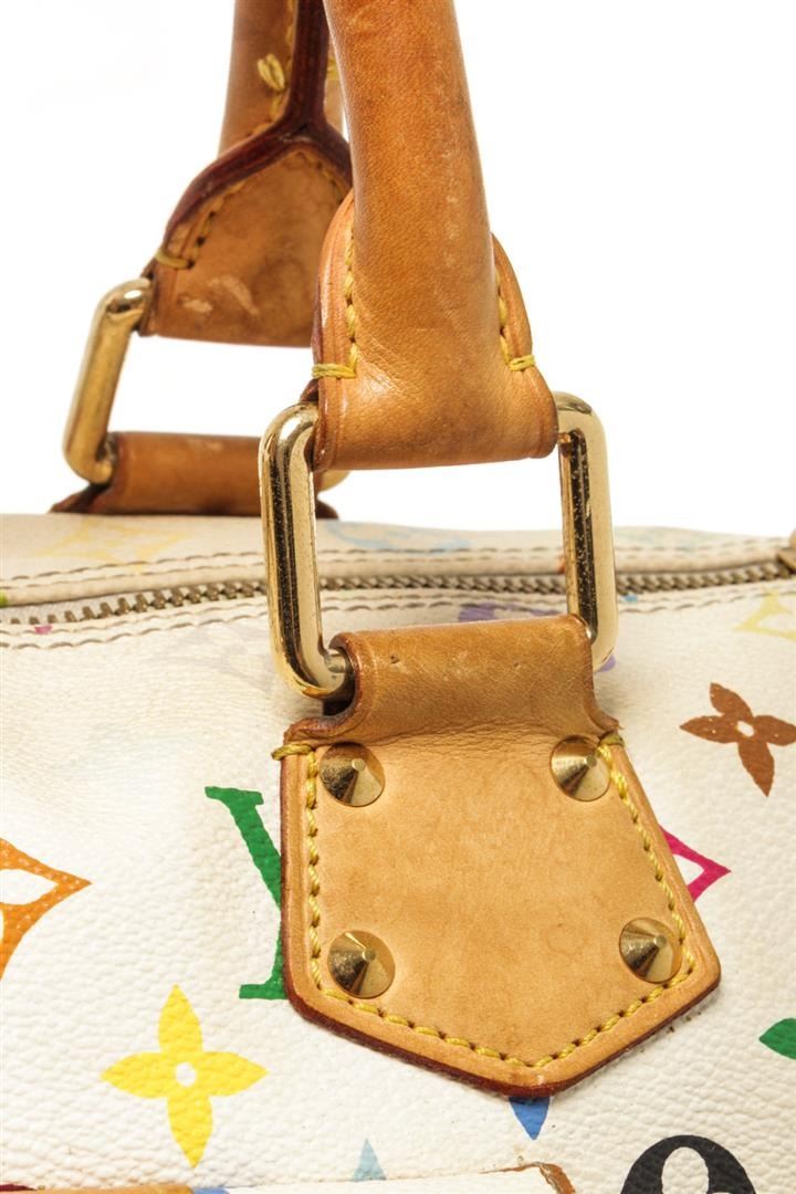 One Louis Vuitton Multicolor White Calf Leather Speedy 30 Handbag. Item is sold AS-IS. All available information is listed in the description and shown in the photo. Louis Vuitton Multicolor White Calf Leather Speedy 30 Handbag with louis vuitton for everyday use. white in color the bag is crafted from louis vuitton's multicolor monogram canvas. it has gold tone hardware and enough room to hold your everyday essentials. speedy is a bag that can be worn on any occasion. White on bag is worn and discolored, vachetta is stained, hardware is scratched. Please refer to photos.