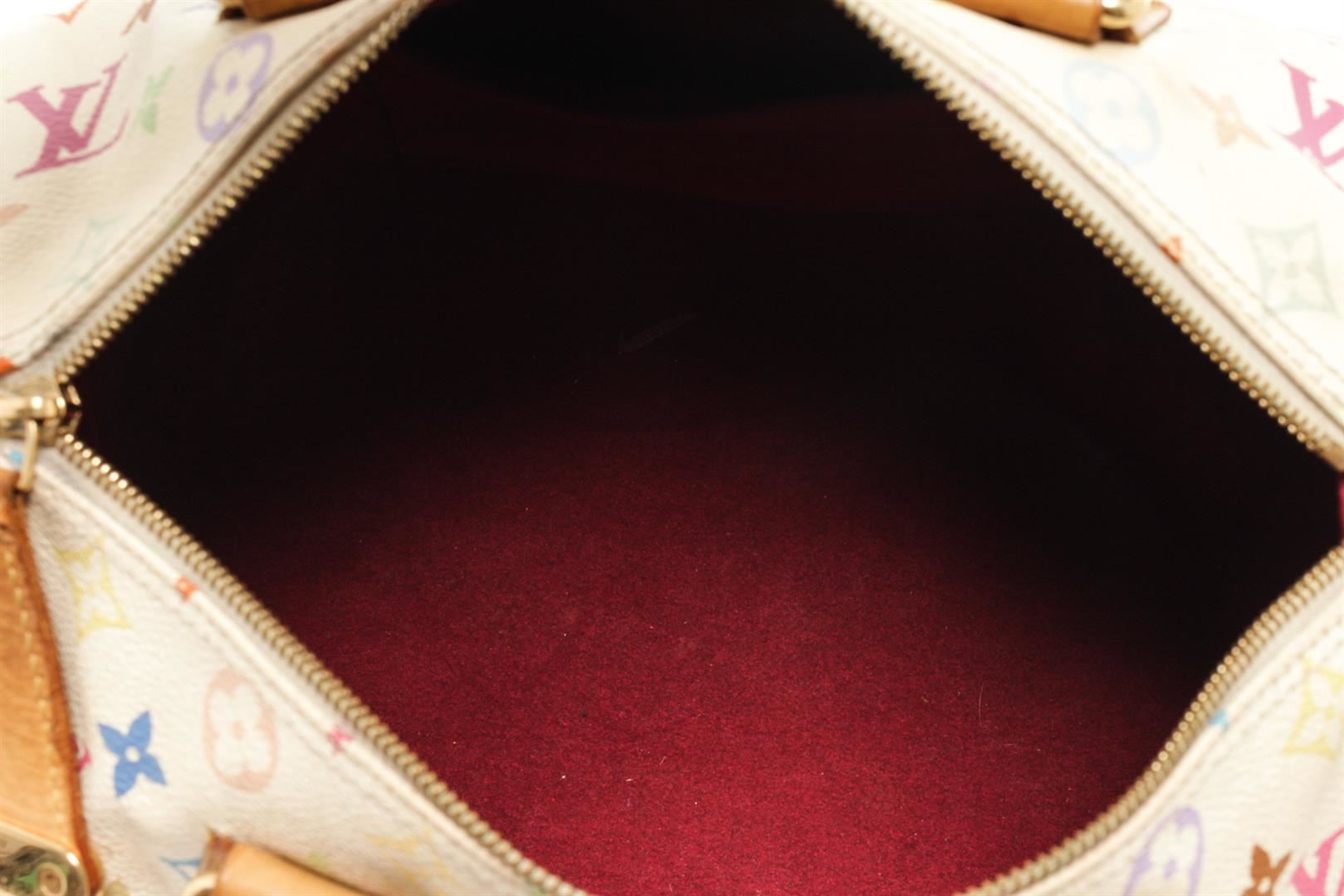One Louis Vuitton Multicolor White Calf Leather Speedy 30 Handbag. Item is sold AS-IS. All available information is listed in the description and shown in the photo. Louis Vuitton Multicolor White Calf Leather Speedy 30 Handbag with louis vuitton for everyday use. white in color the bag is crafted from louis vuitton's multicolor monogram canvas. it has gold tone hardware and enough room to hold your everyday essentials. speedy is a bag that can be worn on any occasion. White on bag is worn and discolored, vachetta is stained, hardware is scratched. Please refer to photos.