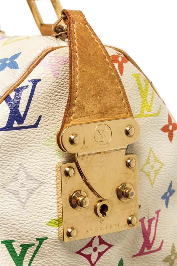 One Louis Vuitton Multicolor White Calf Leather Speedy 30 Handbag. Item is sold AS-IS. All available information is listed in the description and shown in the photo. Louis Vuitton Multicolor White Calf Leather Speedy 30 Handbag with louis vuitton for everyday use. white in color the bag is crafted from louis vuitton's multicolor monogram canvas. it has gold tone hardware and enough room to hold your everyday essentials. speedy is a bag that can be worn on any occasion. White on bag is worn and discolored, vachetta is stained, hardware is scratched. Please refer to photos.