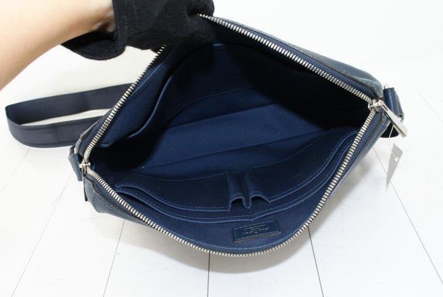 Men's navy blue Taiga leather Louis Vuitton Grigori PM messenger bag with silver-tone hardware, single flat canvas logo shoulder strap, debossed logo at front corner, dual slit pockets at back, navy blue canvas lining, five slit pockets at interior walls, dual pen holders at interior wall and zip closure at top. Height: 11" Width: 13" Depth: 1.75" Shoulder Strap Drop: 17"