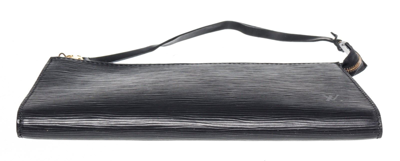 Louis Vuitton Navy Epi Leather Pochette Accessories Shoulder Bag with epi leather, silver-tone hardware, trim tan vachetta leather, top handle, zipper closure.