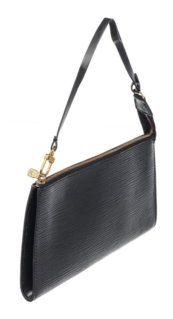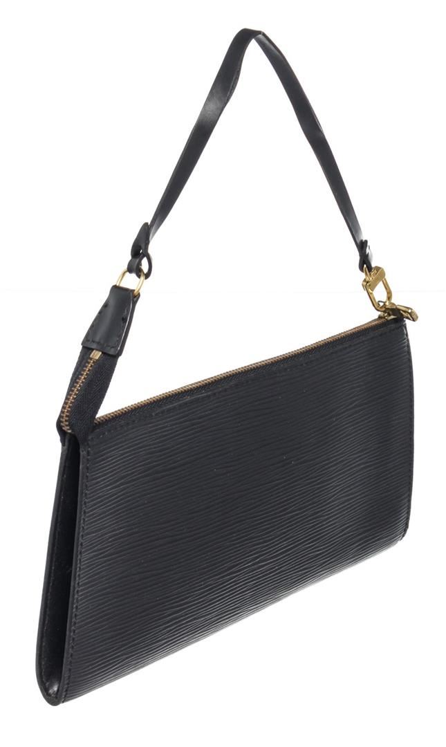 Louis Vuitton Navy Epi Leather Pochette Accessories Shoulder Bag with epi leather, silver-tone hardware, trim tan vachetta leather, top handle, zipper closure.