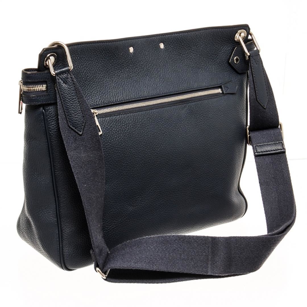 One Louis Vuitton Navy Leather Armand Messenger bag. Item is sold AS-IS. All available information is listed in the description and shown in the photo. Louis Vuitton navy leather Armand messenger bag with leather exterior, orange suede lining, silver-tone hardware, zipper closure, adjustable fabric strap, one exterior zip pocket, and one main compartment with a slip pocket. Height: 12.5" Width: 14" Depth: 5", Handle Drop: / 31.75 x 35.56 x 12.7 Cm