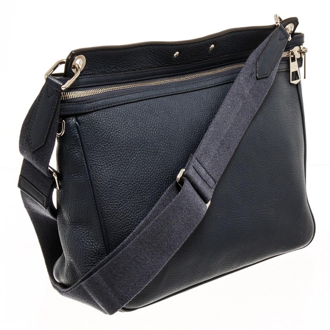 One Louis Vuitton Navy Leather Armand Messenger bag. Item is sold AS-IS. All available information is listed in the description and shown in the photo. Louis Vuitton navy leather Armand messenger bag with leather exterior, orange suede lining, silver-tone hardware, zipper closure, adjustable fabric strap, one exterior zip pocket, and one main compartment with a slip pocket. Height: 12.5" Width: 14" Depth: 5", Handle Drop: / 31.75 x 35.56 x 12.7 Cm