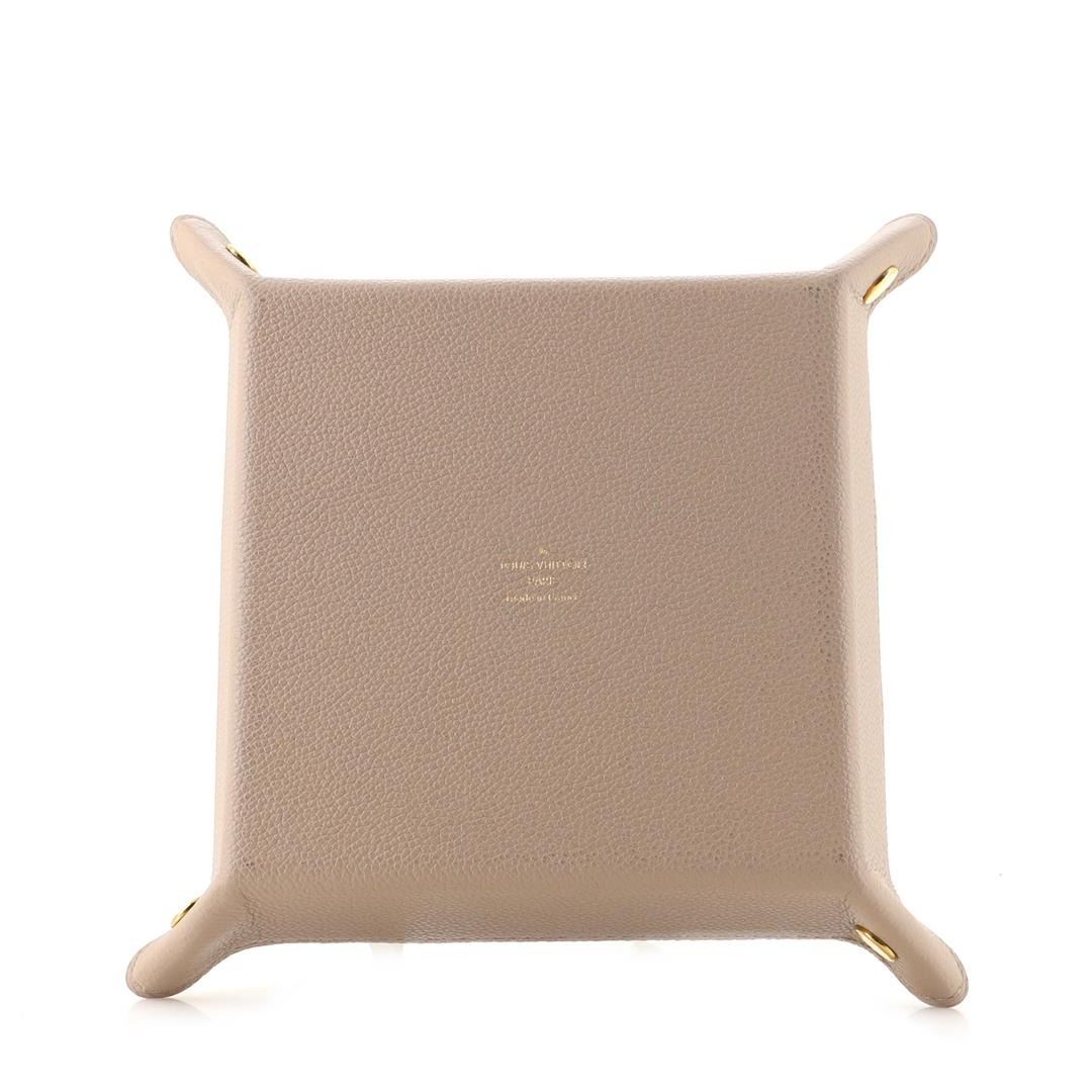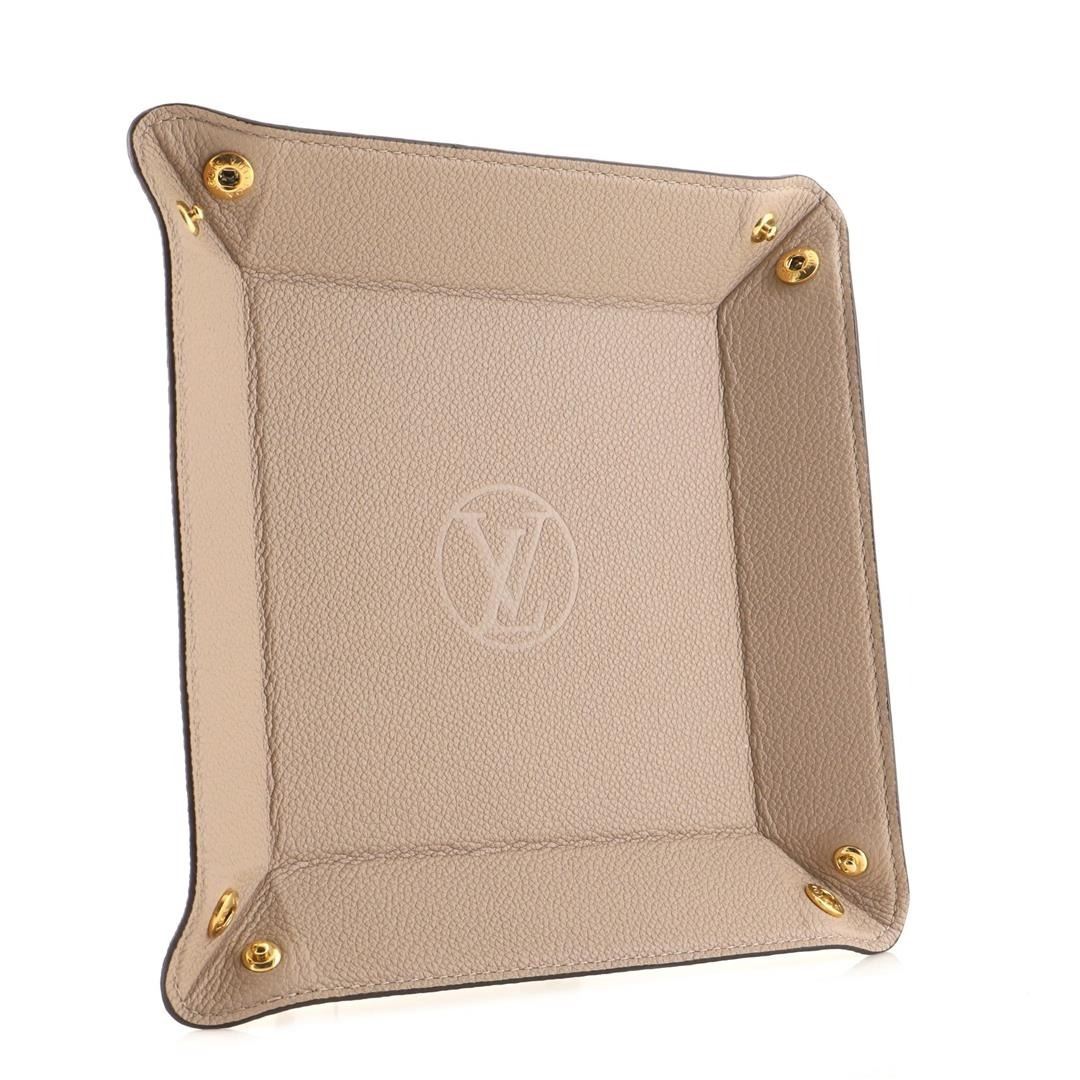 Louis Vuitton Change Tray features neutral/beige coated canvas, gold-tone hardware and embossed LV logo at the center. Suitable to place keys, jewelry, etc.