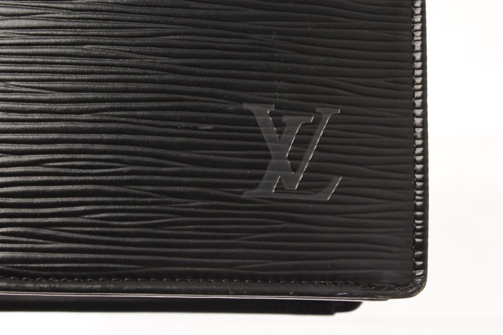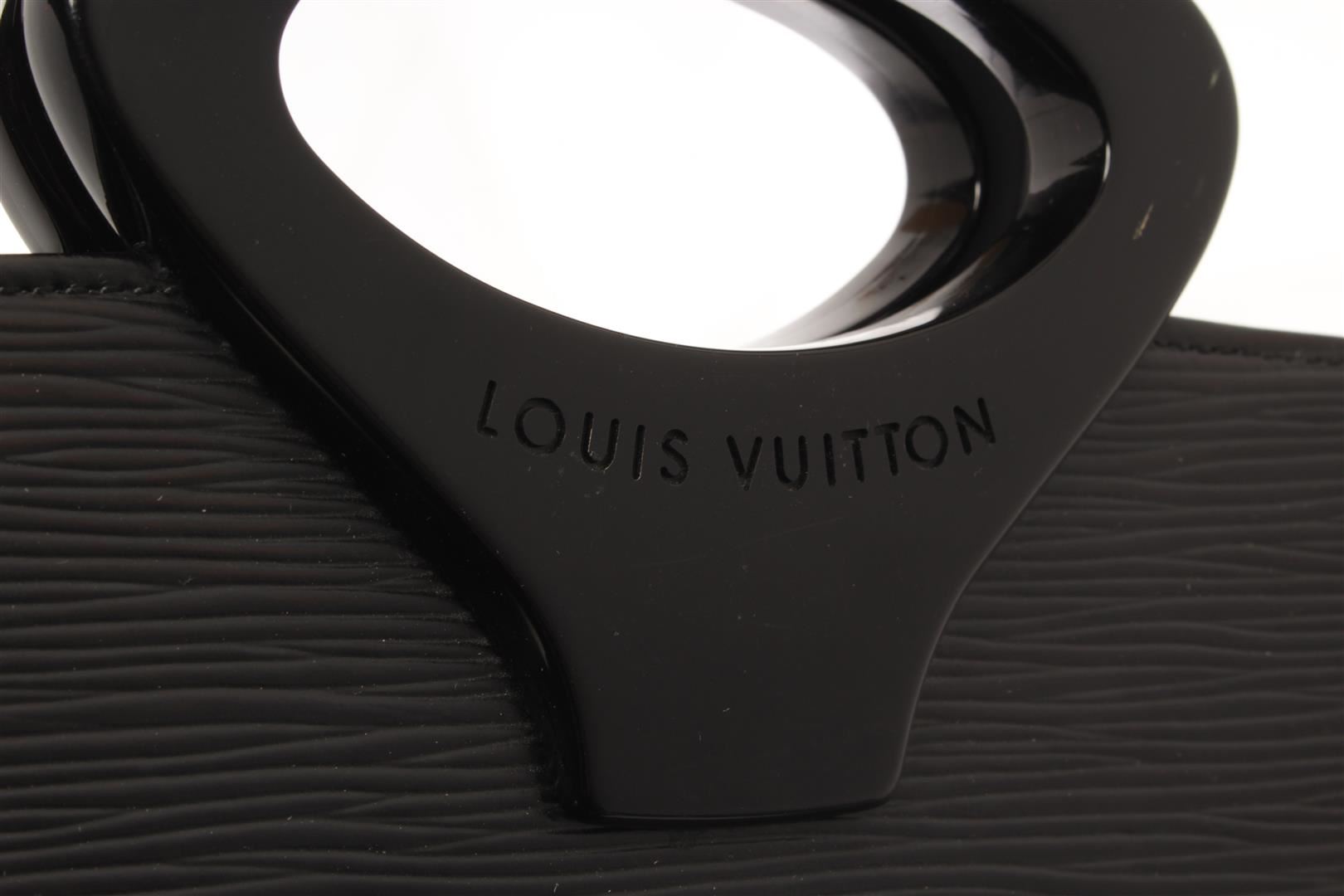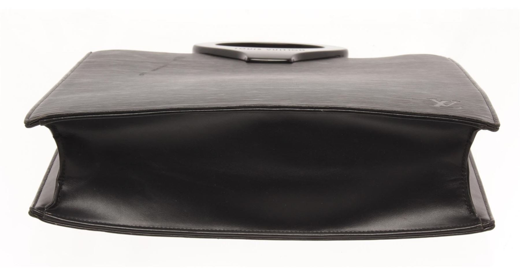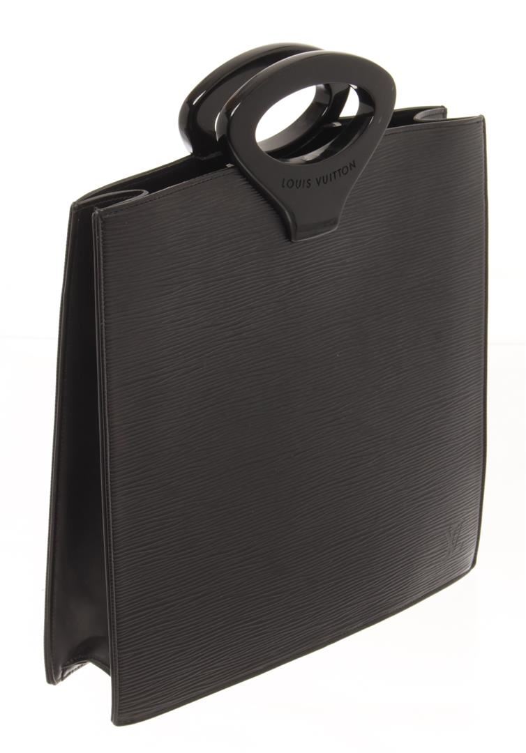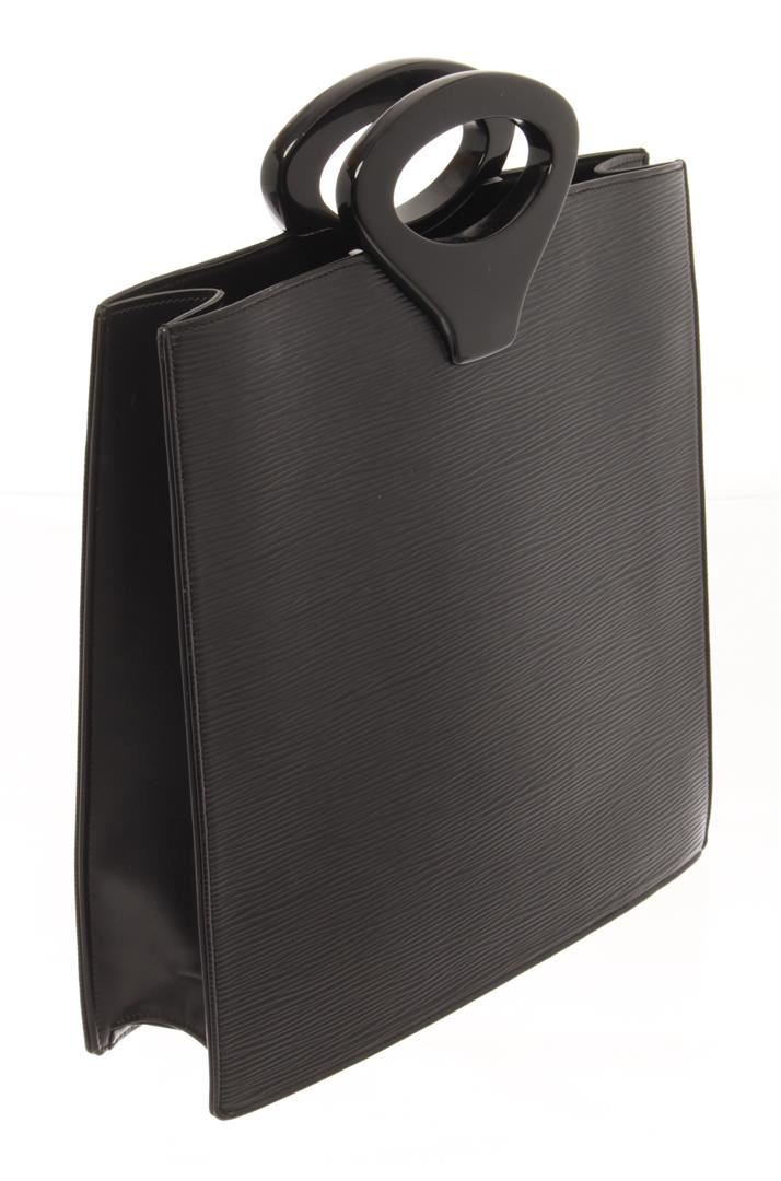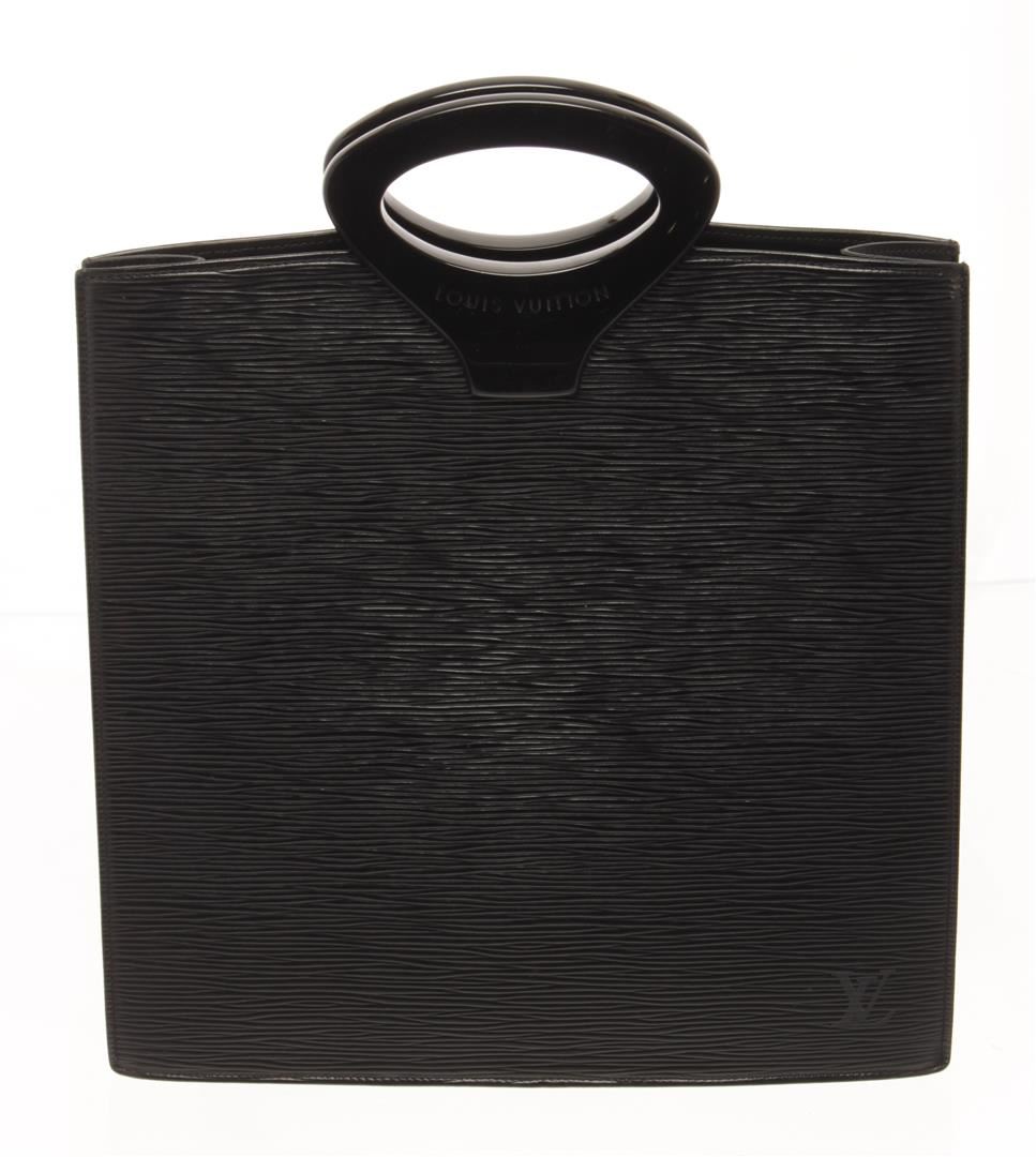 One Louis Vuitton Noir Epi Leather Ombre Tote Bag. Item is sold AS-IS. All available information is listed in the description and shown in the photo. Louis Vuitton Noir Epi Leather Ombre Tote Bag with black epi leather, dual flat resin top handles, subtle embossed lv logo at front and black and silver-tone hardware accents, its open top showcases a grey microfiber-lined interior with a slip pocket perfect for holding your daily essentials. Height: 26.67 cm (10.5 in), Width: 27.94 cm (11 in), Depth: 6.35 cm (2.5 in)