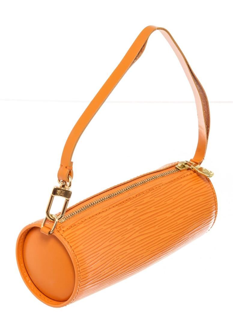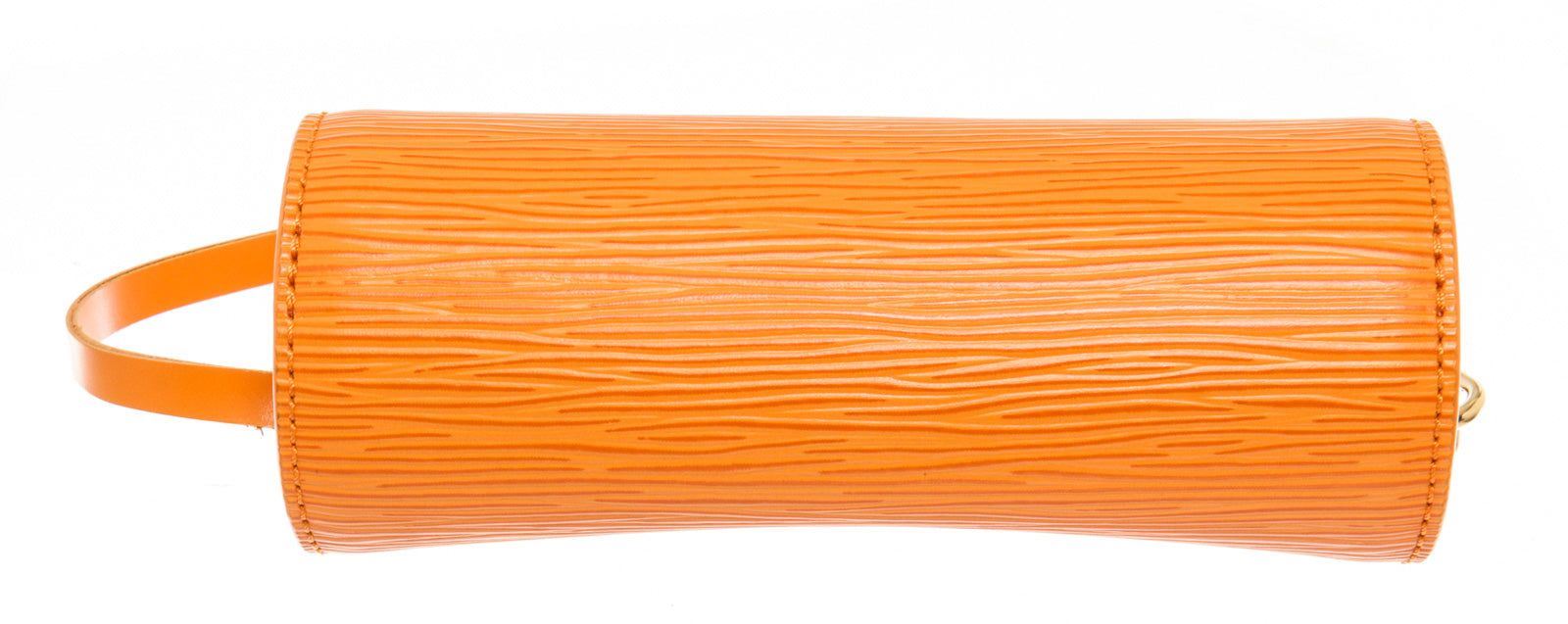 Louis Vuitton Orange Epi Leather Mini Papillon Pochette Bag with silver-tone hardware, monogram material, tan vachetta leather trim, top handle, embossed logo, leather shoulder strap, and zipper closure.