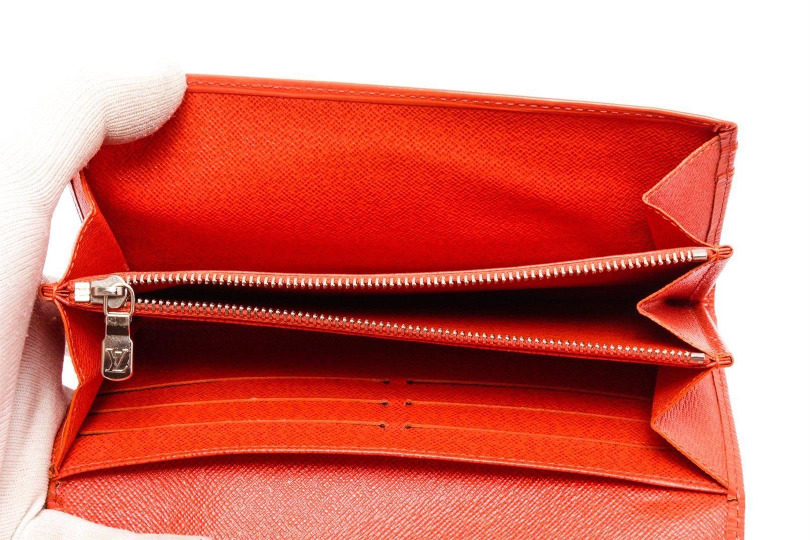 Louis Vuitton Orange Epi Leather w/Intials Sarah Wallet with silver-tone hardware, tonal coated canvas lining, six interior compartments; one with zip closure, four card slots and snap closure. Please note: the inside has personalized monogram initials J.Y.P Measurements: Length: 0.75 in / 2 cm Width: 7.5 in / 19 cm 4 in / 10 cm Condition: Pre-Owned Good overall, please see photographs for detail.