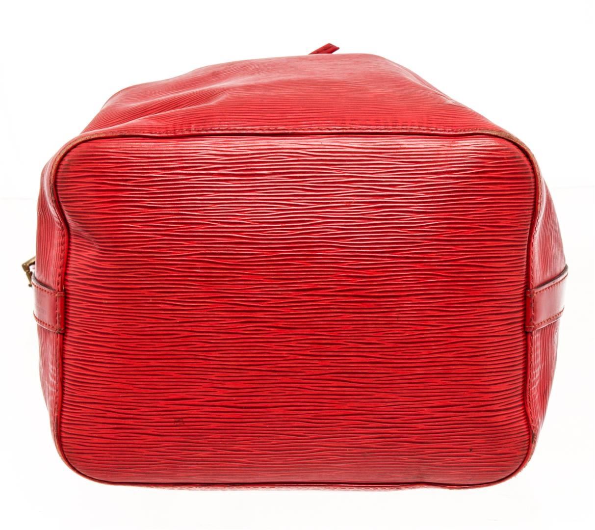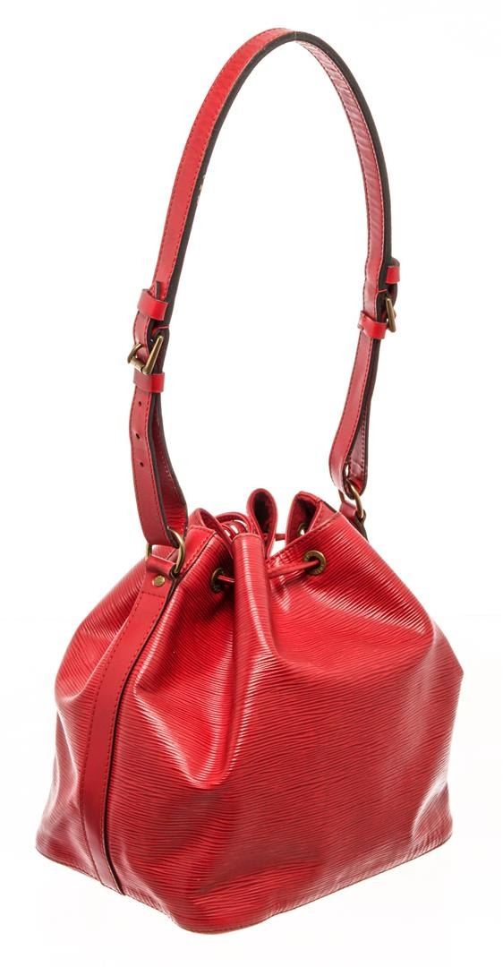 Louis Vuitton Petit Noe Shoulder Bag Castilian Red Epi Leather. Brand: Louis Vuitton, Style: Petit Noe, Type: Shoulder Bag, Exterior Color: Castilian Red, Exterior Material: Epi Leather, Exterior Pockets: None, Interior Color: Red, Interior Material: Alcantara, Interior Pockets: None, Closure: Drawstring, Handle/Strap Type: Adjustable Shoulder Strap, Length: 1N/A", Width: 7.5", Height: 1N/A.5", Strap Drop: 12". Condition: Corner wear. Additional Information: Gold Hardware. Item is sold AS-IS and all information pertaining to this lot is available in the photos or this description.