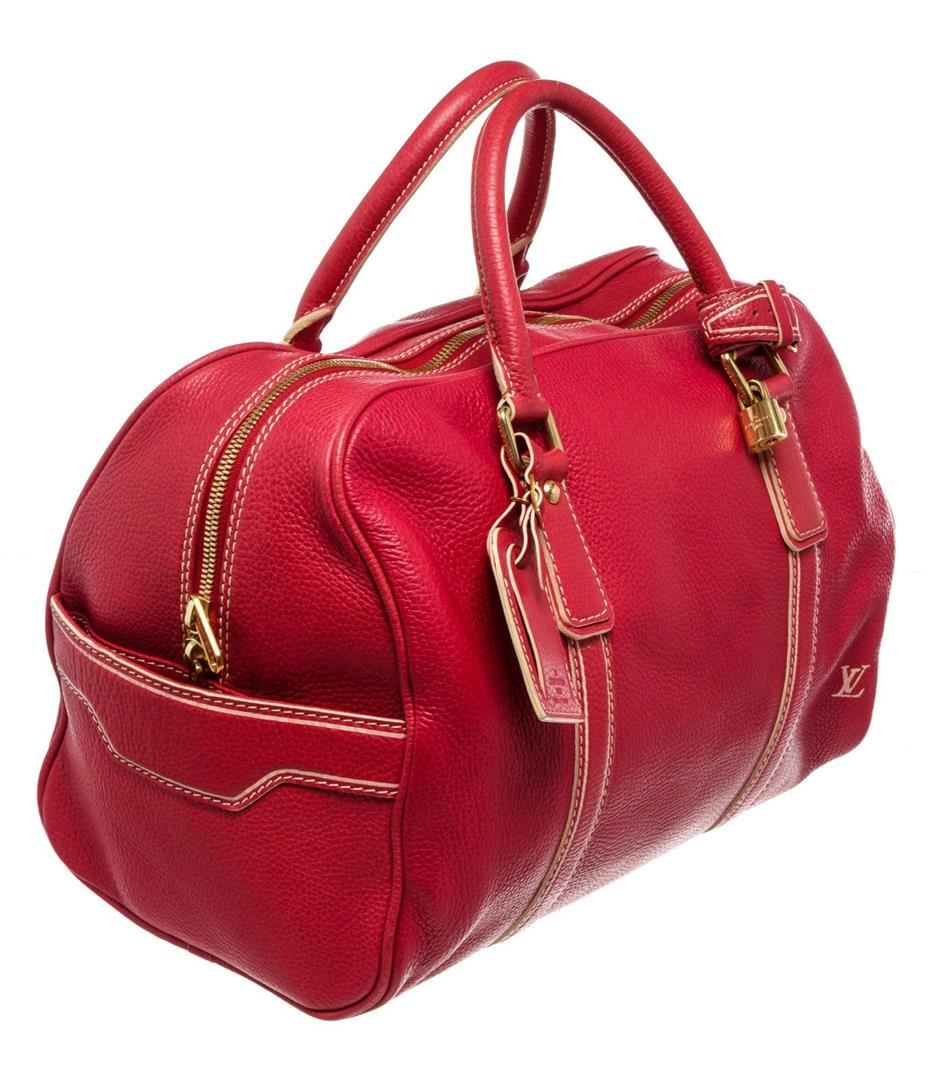 Louis Vuitton Pink Leather Carryall Duffel Bag with silver-tone hardware, black piping and leather trim, dual rolled top handles, dual exterior slit pockets at sides, black jacquard woven lining, single zip pocket at interior wall and two-way zip closures at top.