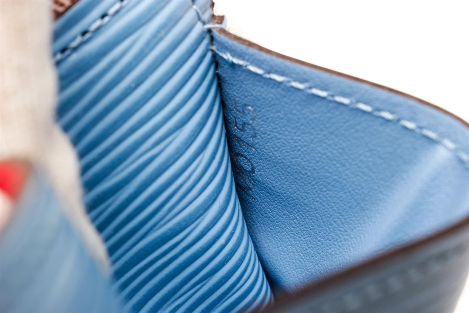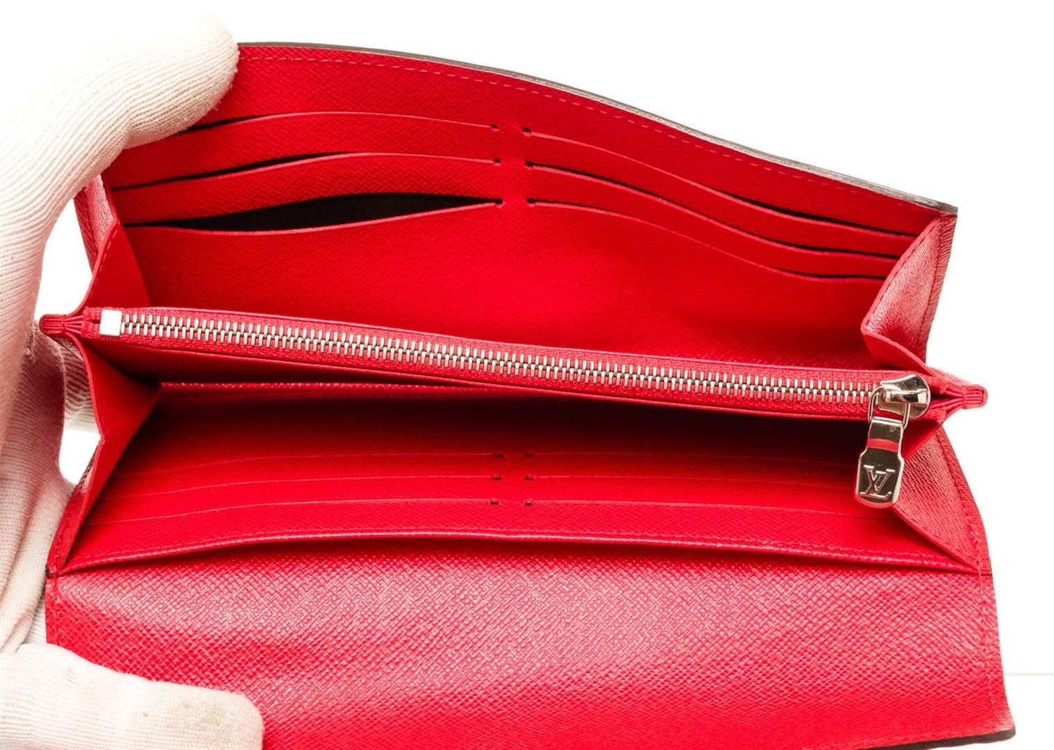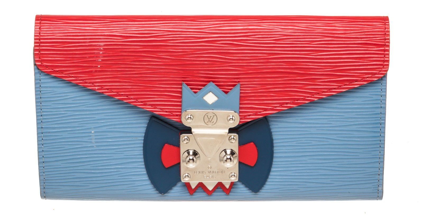 Louis Vuitton Red Blue Leather Tribal wallet with leather, gold-tone hardware, trim tan vachetta leather, interior three compartments pocket and push lock closure.