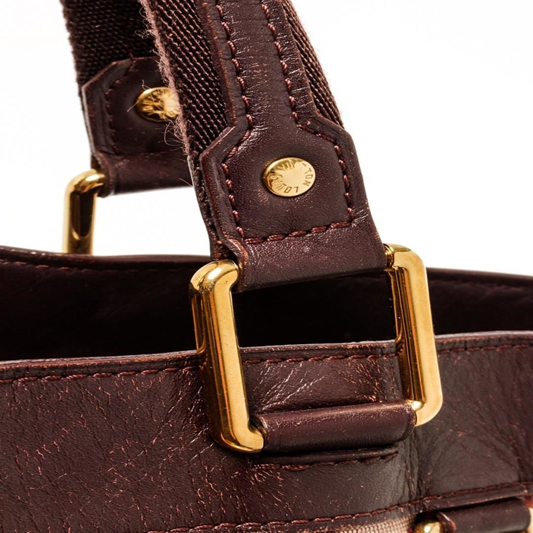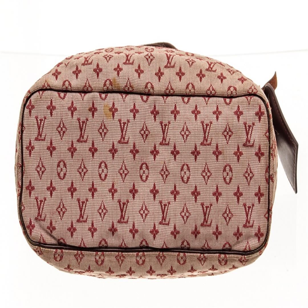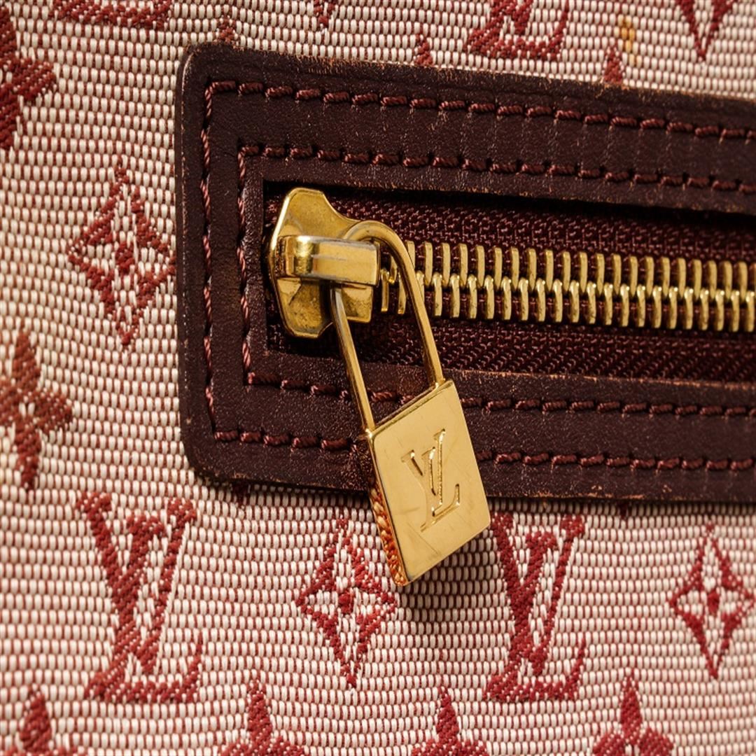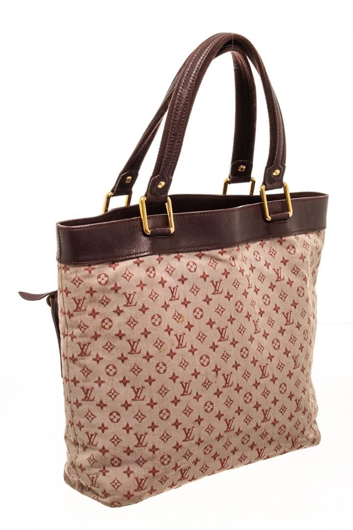 One Louis Vuitton Red Canvas Lucille GM Tote Bag. Item is sold AS-IS. All available information is listed in the description and shown in the photo. Louis Vuitton red canvas Lucille GM tote bag features a monogram canvas exterior, beige fabric lining, burgundy leather top handles, trims, and luggage tag; gold-tone hardware, open top, one exterior zip pocket, and one interior zip pocket. There are stains on the canvas and on the lining as shown in pictures. Height: 11.81" Width: 4.33" Depth: 12.2", Shoulder Drop: / 29.99 x 10.99 x 30.98 Cm