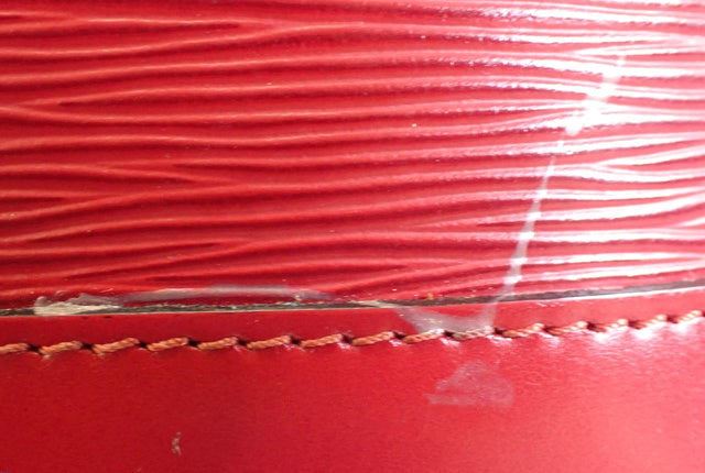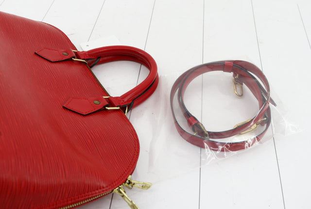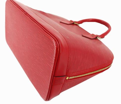 Louis Vuitton Red Epi Leather Alma PM Handbag. All available information is listed in the description and shown in the photos. Red Epi leather Louis Vuitton Alma PM with gold-tone hardware, dual rolled top handle, single detachable shoulder strap, red Alcantara lining, single interior slit pocket and two-way zip closure. 12.5"x6"x9.5"xBag Drop:3"/31.7cmx15.2cmx24.1cmxBag Drop:7.6cm