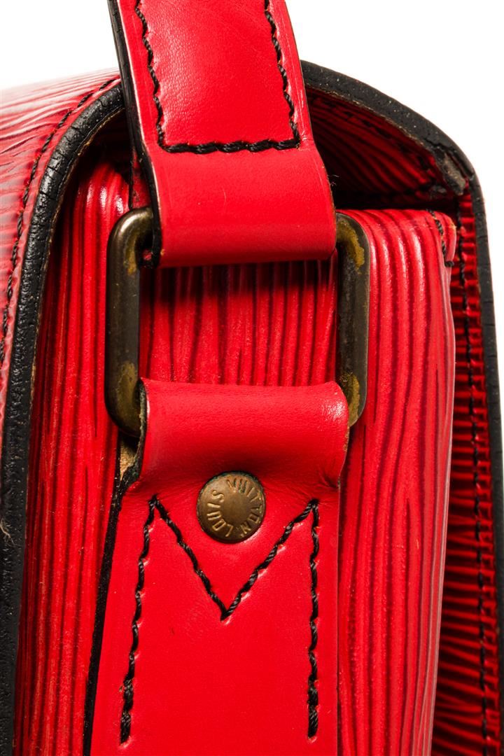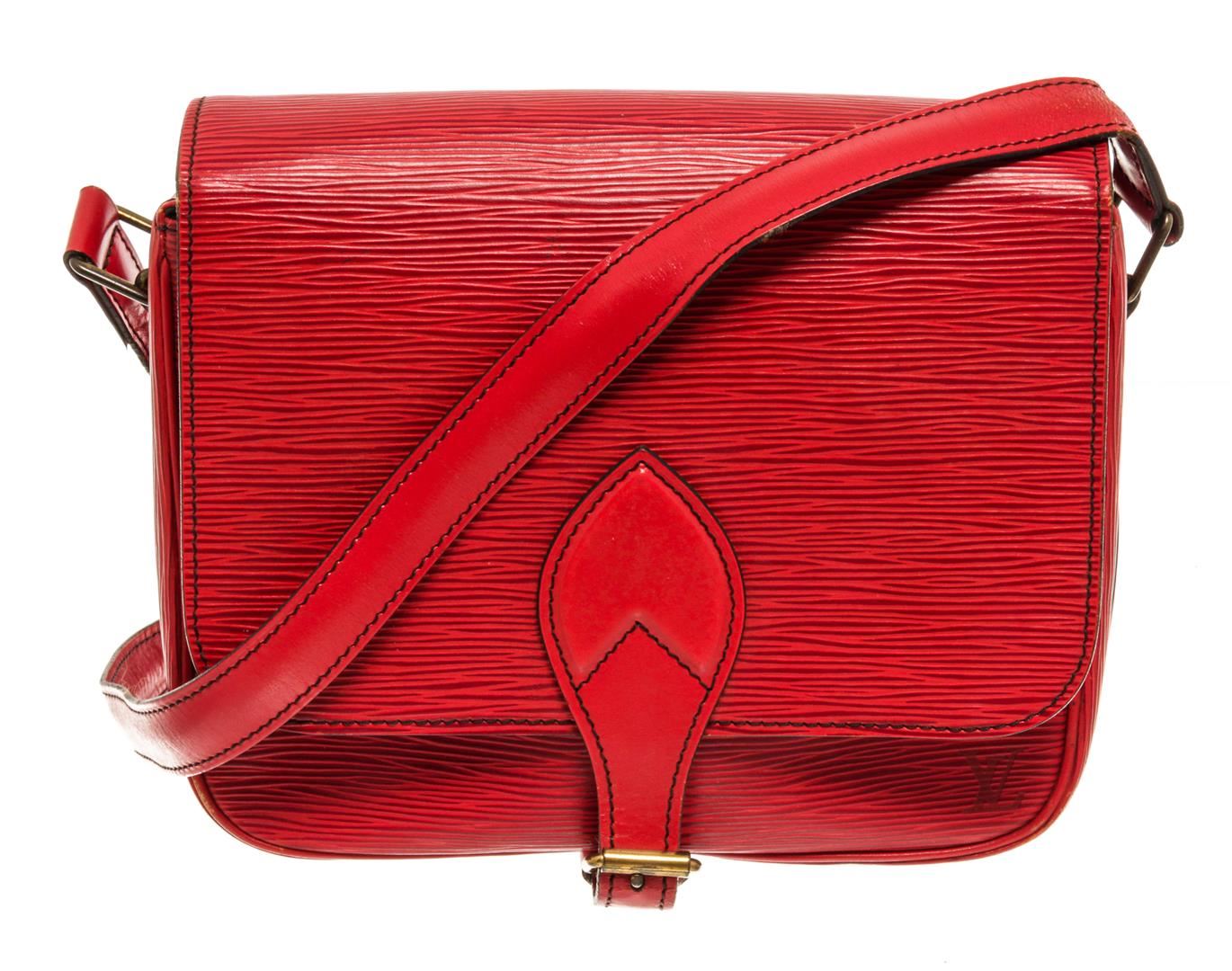 One Louis Vuitton Red Epi Leather Cartouchiere Crossbody Bag. Item is sold AS-IS. All available information is listed in the description and shown in the photo. Louis Vuitton Red Epi Leather Cartouchiere Crossbody Bag with gold-tone hardware, leather trim, black leather lining, interior compartments pocket, adjustable leather shoulder crossbody strap and flap closure.