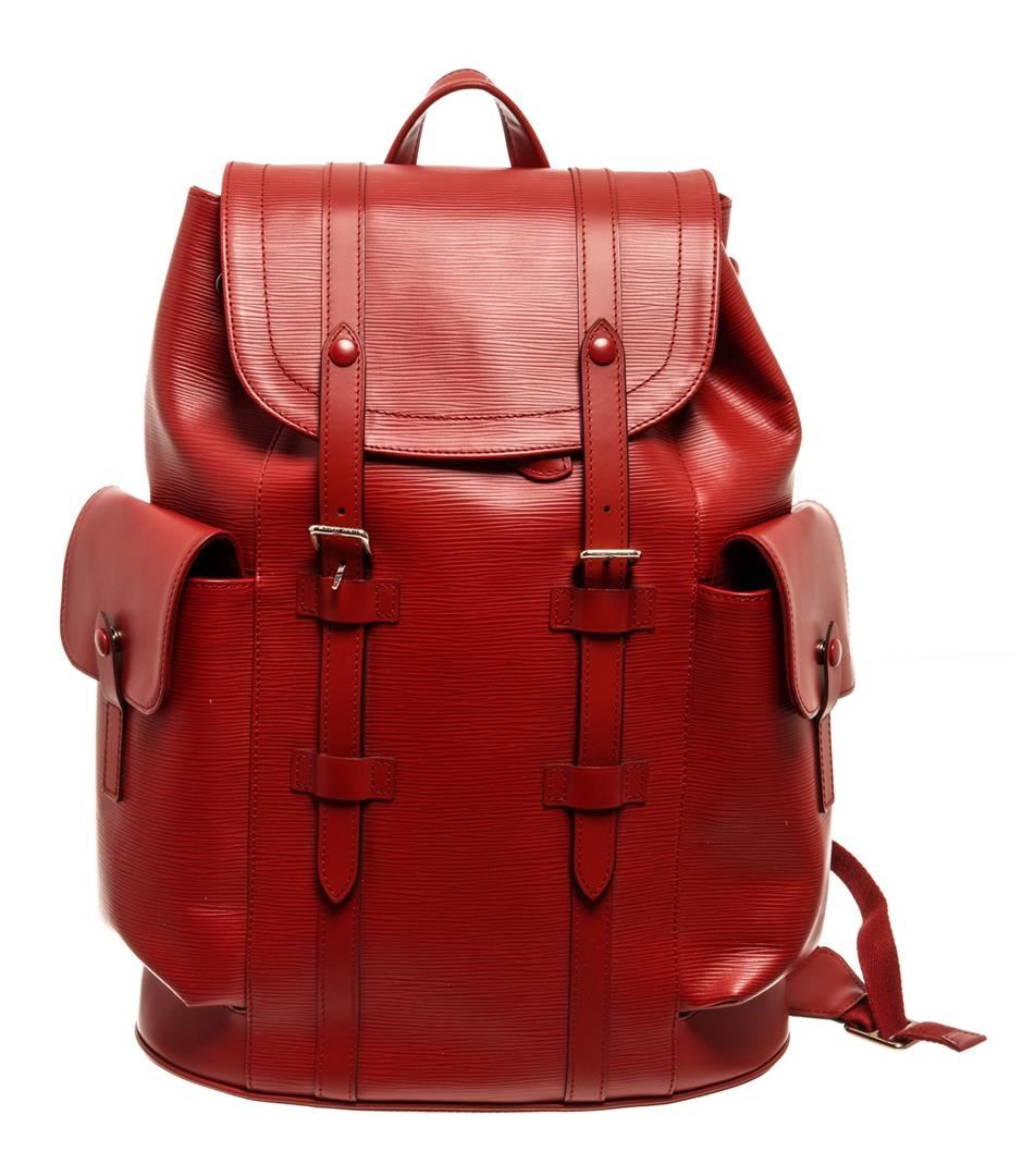 One Louis Vuitton Red Epi Leather Christopher PM Backpack Bag. Item is sold AS-IS. All available information is listed in the description and shown in the photo. Louis Vuitton Red Epi Leather Christopher PM Backpack Bag with epi leather, gold-tone hardware, exterior slip pocket, interior zip pocket, shoulder strap and snap closure.