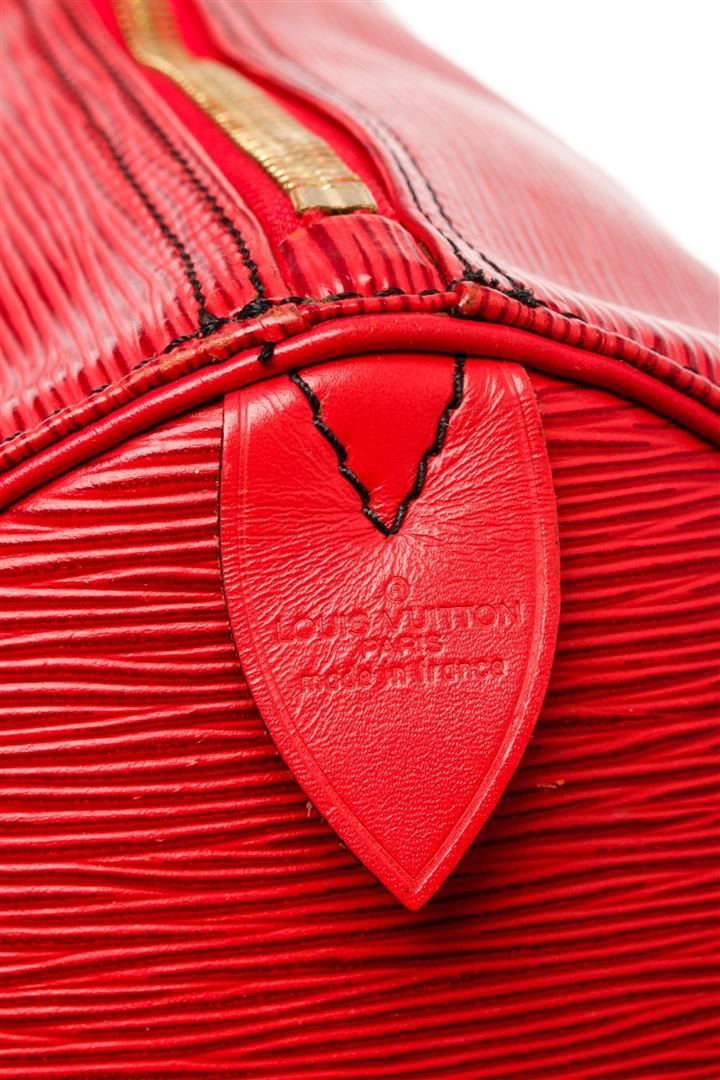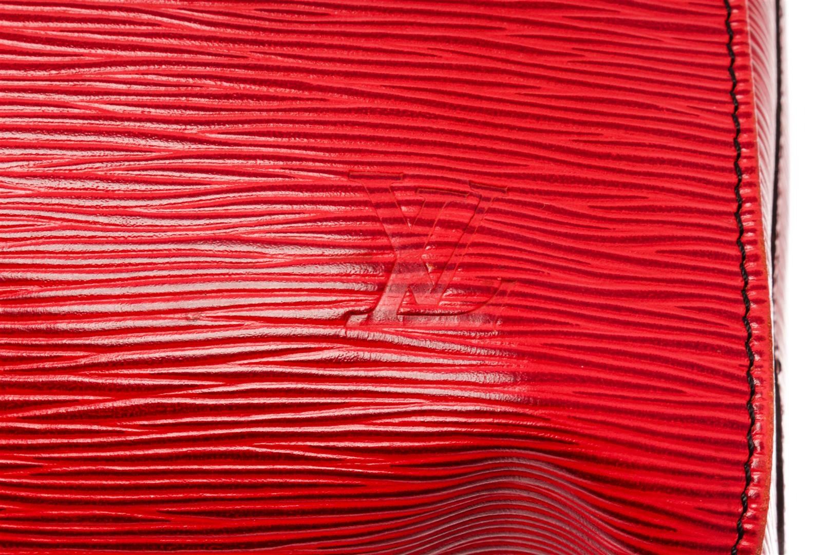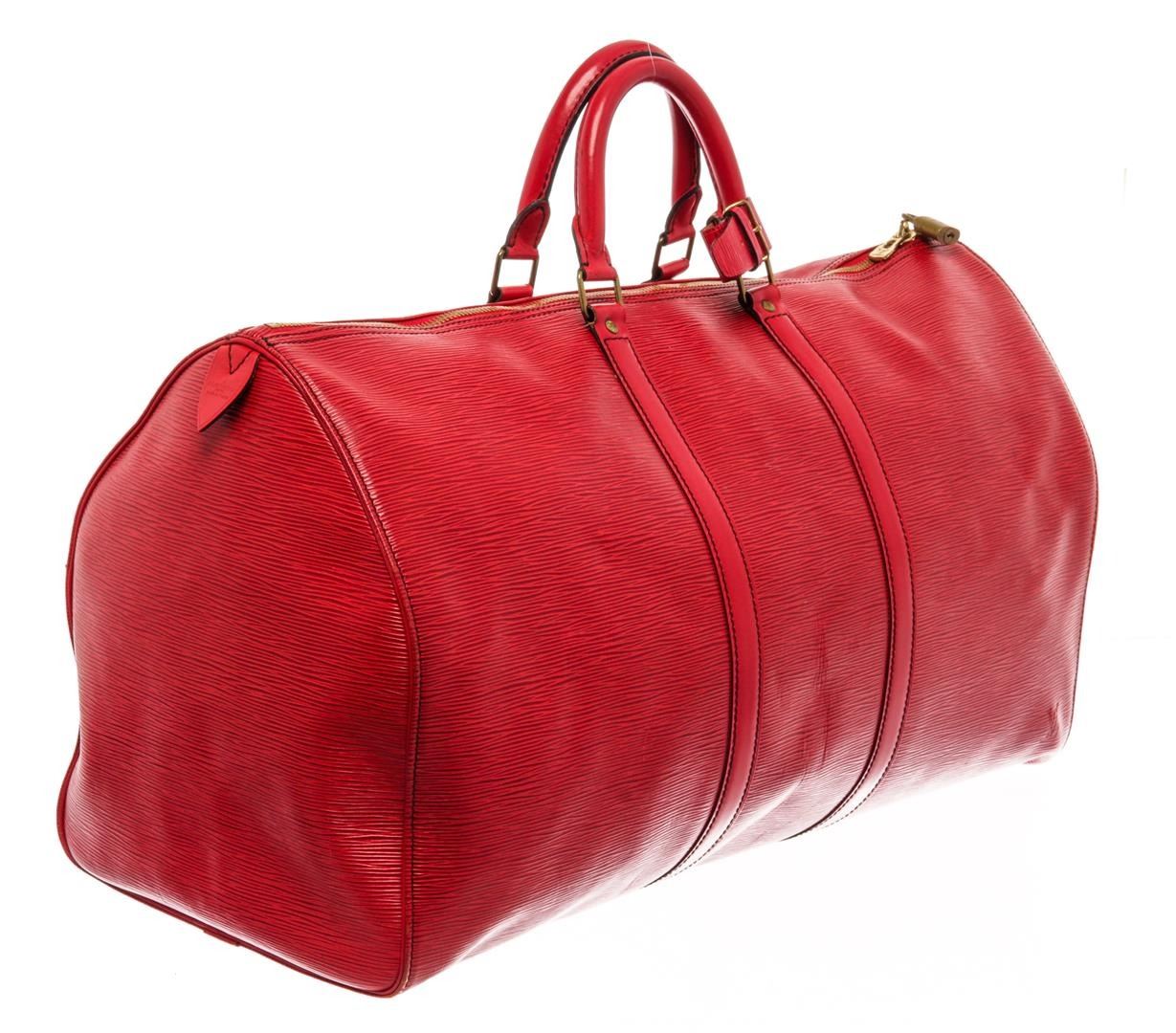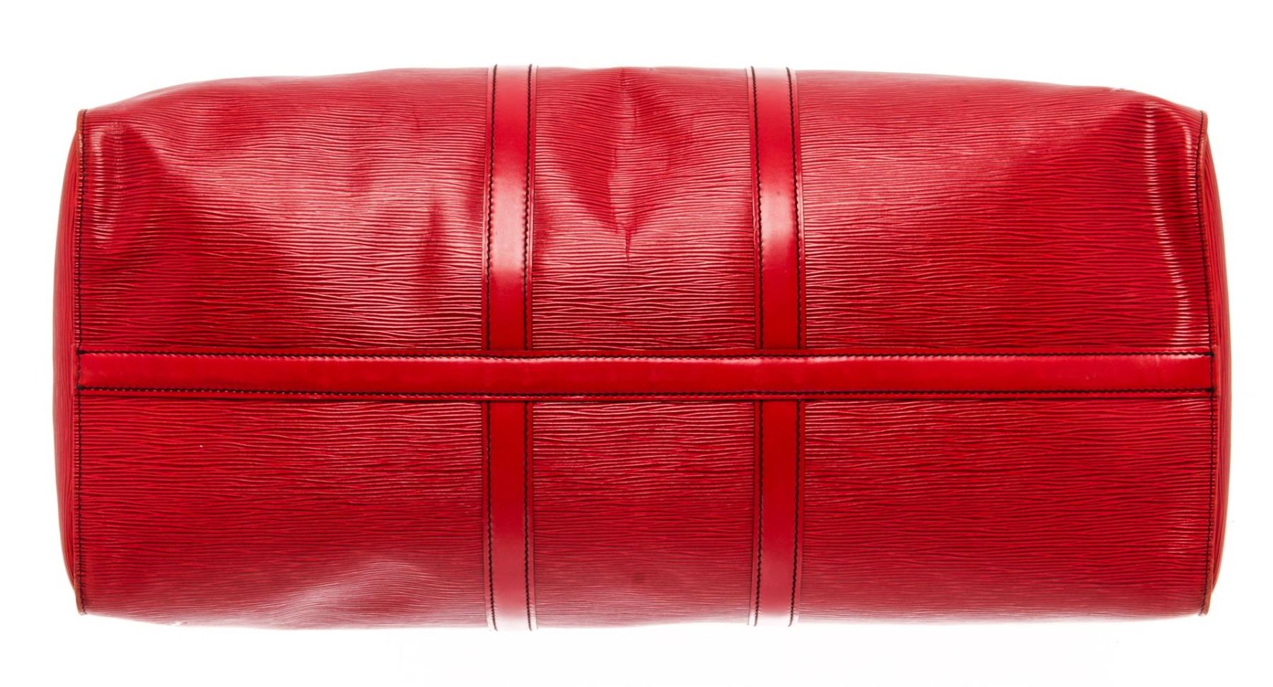 Louis Vuitton Red Epi Leather Keepall 55 Travel Bag. All available information is listed in the description and shown in the photos. Louis Vuitton Red Epi Leather Keepall 55 Travel Bag with gold-tone brass hardware, rolled handles & dual shoulder straps, suede lining & single interior pocket, top zipper closure. Condition Details: Slight creasing, minor wear/discoloration on bottom corners, some tarnishing on zipper pull. Height: 16" Width: 22" Depth: 10.5", Handle Drop: 4" / 40.64 x 55.88 x 26.67 cm
