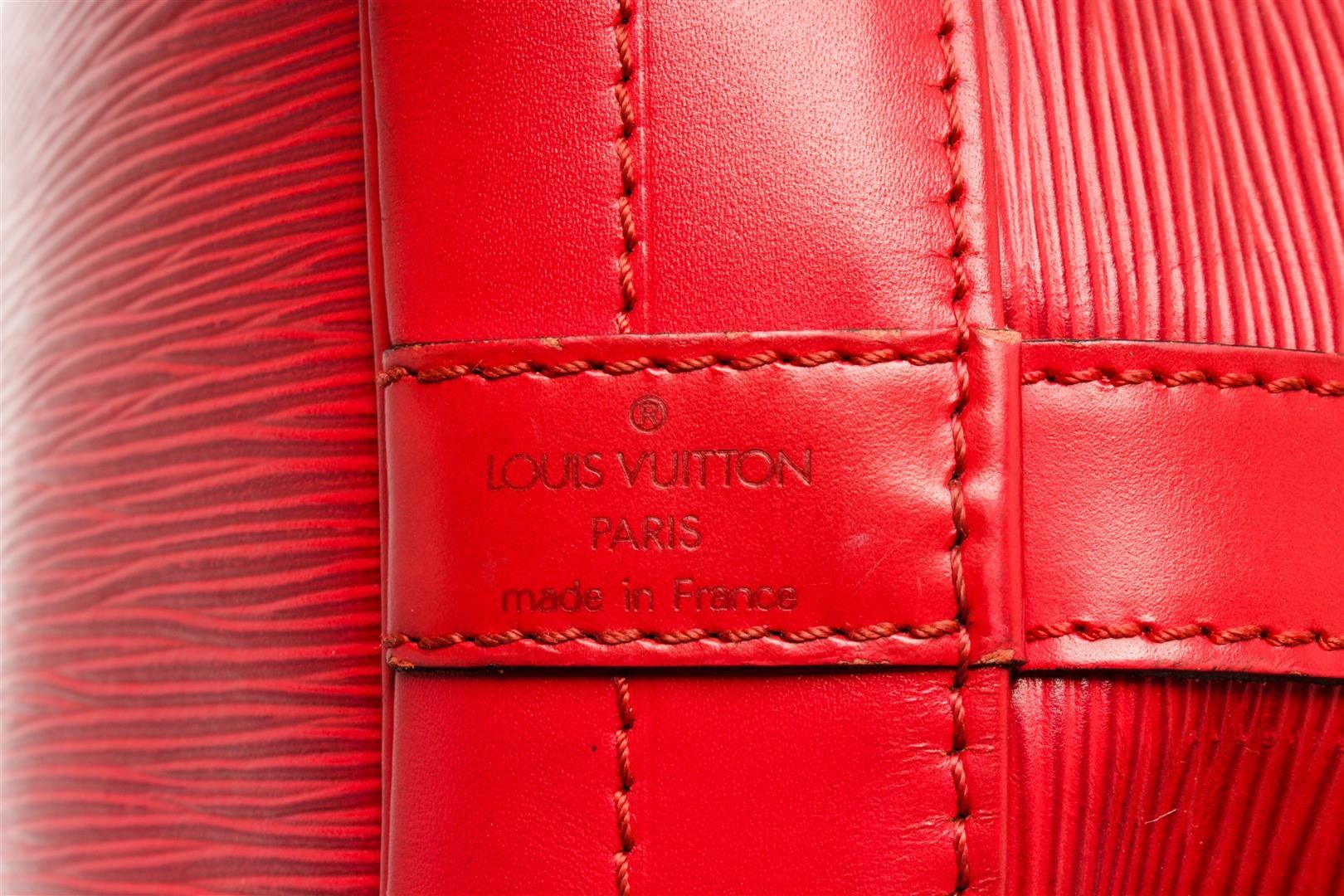 Louis Vuitton Red Epi Leather Noe Bucket Bag. All available information is listed in the description and shown in the photos. Louis Vuitton Red Epi Leather Noe Bucket Bag with red epi leather, printed, gold-tone hardware, single adjustable shoulder strap, alcantara lining, drawstring closure at top. Height: 13.5" Width: 10.5" Depth: 7.25" Shoulder Strap Drop: 8.5" / Height: 34.29 cm Width: 26.67 cm Depth: 18.41 cm Shoulder Strap Drop: 21.59 cm